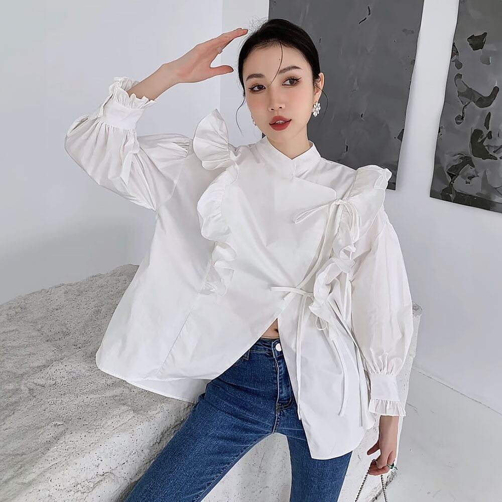 オーバーサイズサイドオープンスタンドカラーブラウス チュニック フリル サイド開口 リボン開口 肩フリル シャツ ブラウス ボタン スタンドカラー 長袖 ボリューム袖 パフスリーブ 襟付き オーバーサイズ 大きめ ざっくり 袖口フリル ワイド 襟なし かわいい 大人可愛い きれいめ チャイナ風 おしゃれ お洒落 こなれ感 ラブリー キュート ガーリー 個性的 モード系 モダン 主役級 存在感 無地 レディース お出かけ ホワイト フリーサイズ 韓国コーデ 韓国ファッション