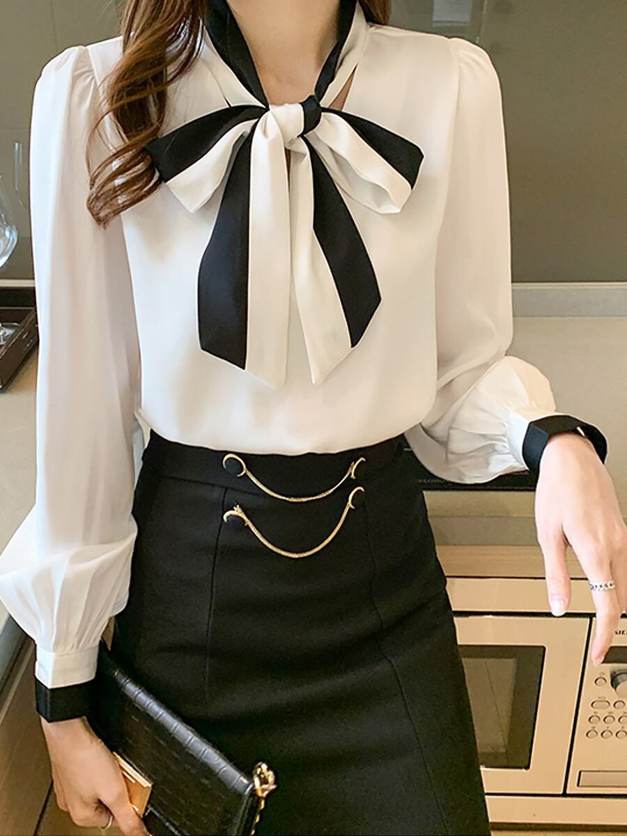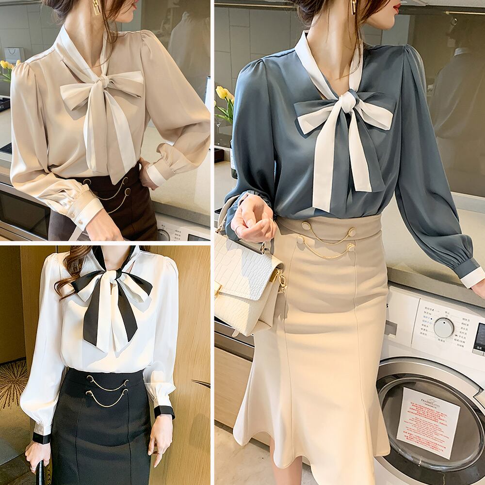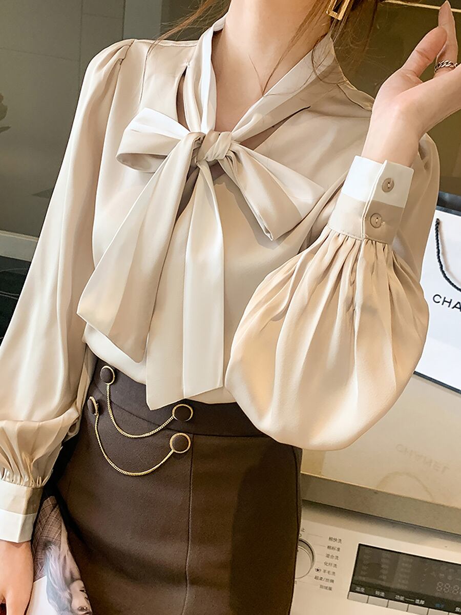 全3色 バイカラーボウタイブラウス リボンブラウス オフィスブラウス オフィススタイル リボンタイ ブラウス 長袖 緑 スモークグリーン ベージュ 白 黒 バルーンスリーブ ふんわり袖 袖口ポイント リボン ビッグボウタイ きちんと感 かわいい 大人可愛い きれいめ シンプル カジュアル 大人 上品 おしゃれ お洒落 かっこいい 大人女子 こなれ感 ラブリー キュート エレガント フォーマル 入学式 入園式 謝恩会 レディース 通勤 リクルート 就活 韓国コーデ 韓国ファッション