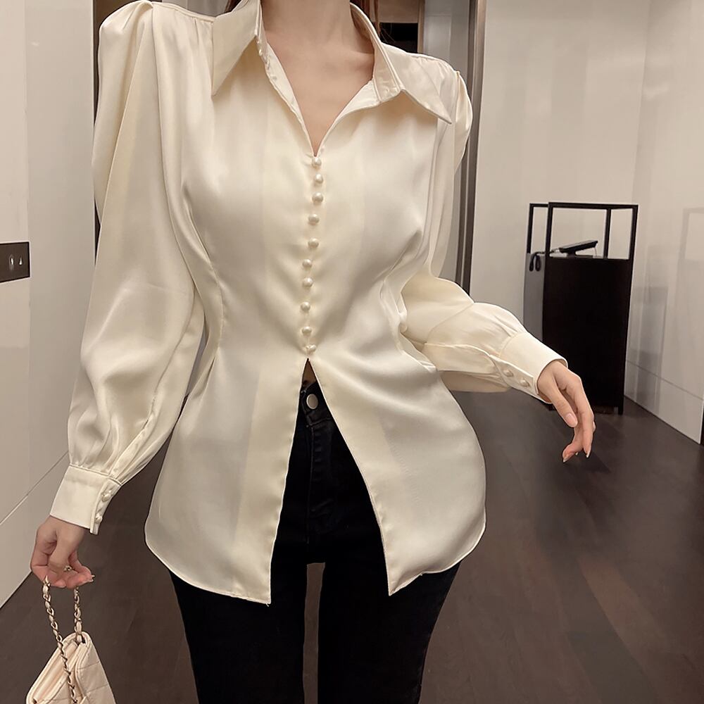 後ろの大きめリボンがポイントの光沢感のある長袖ブラウスです。