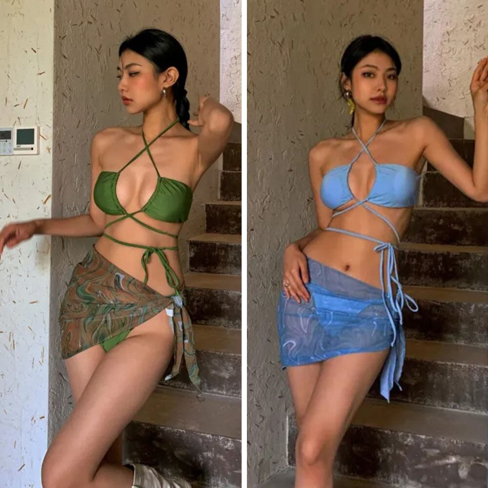 全2色 3点セット 水着 クロスホルターネックビキニ上下+マーブル模様パレオ マイクロビキニ セクシービキニ ビキニ ブラジリアンビキニ ベーシック シンプル スイムウェア パッド付き パッド ワイヤーなし 大胆ビキニ 美脚 レトロ モダン フェミニン セクシー 大人 おおしゃれ お洒落 女っぽ 個性的 レディース ホテル 温泉 海 ビーチ プール リゾート スタイルアップ 韓国 M L XL 韓国コーデ 韓国ファッション 緑 青