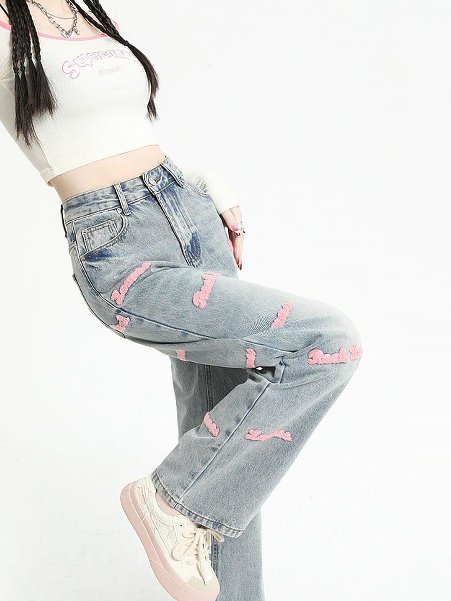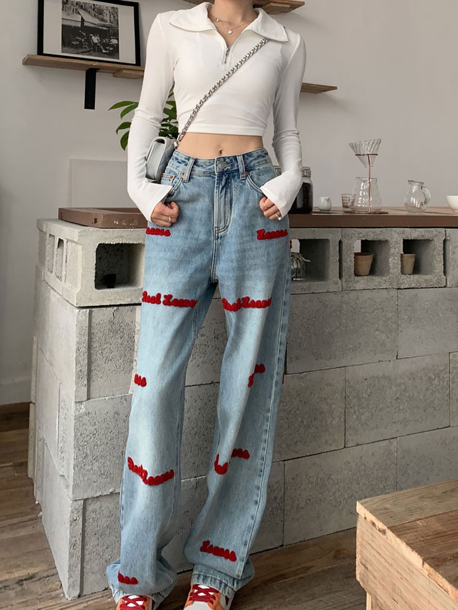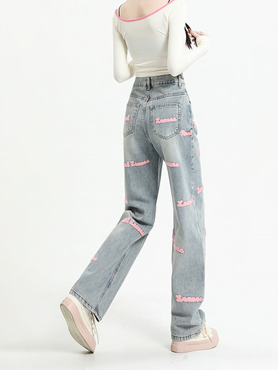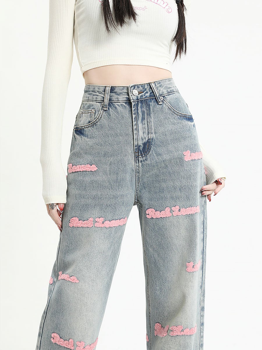 全3色 パイル刺繍ロングデニムパンツ ハイウエスト ワイドルーズデニム ロゴ刺繍 刺繍 ワイド ワイドレッグ 体型カバー ストリート かわいい 大人可愛い ジーパン カジュアル 大人 おしゃれ お洒落 かっこいい 大人可愛い 大人女子 こなれ感 ラフ ラブリー キュート ガーリー 個性的 レディース 学生 通学 デート お出かけ 公園デビュー 女子会 休日 リゾート 旅行 韓国コーデ 韓国ファッション 韓国コーデ 韓国ファッション ピンク 白 赤