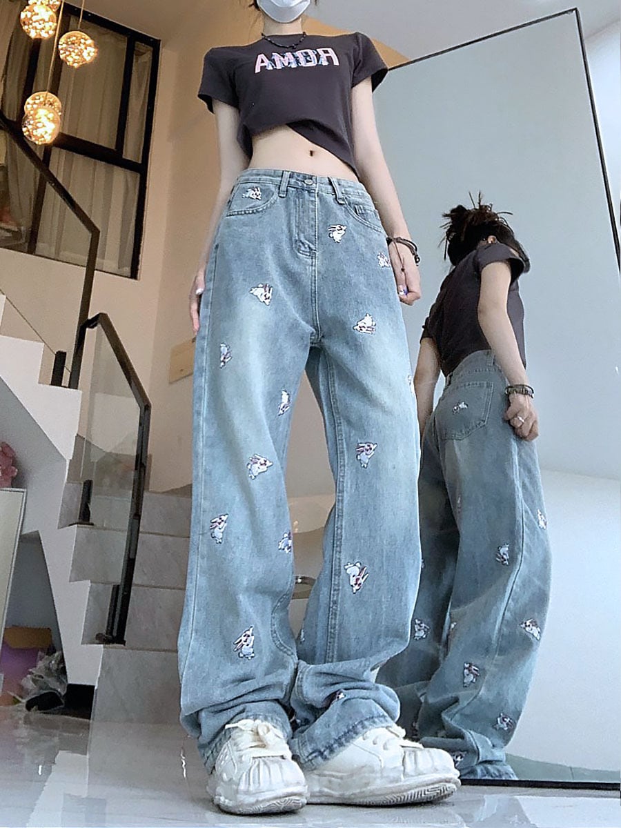 全2種 うさぎ刺繍ロングデニム パンツ ハイウエスト ワイドルーズデニム ラビット うさぎ 刺繍 ワイドレッグ レトロ 体型カバー ヴィンテージ風 かわいい 大人可愛い ジーパン カジュアル 大人 おしゃれ お洒落 かっこいい 大人可愛い 大人女子 こなれ感 ラフ ラブリー キュート ガーリー 個性的 レディース 学生 通学 デート お出かけ 公園デビュー 女子会 休日 リゾート 旅行 韓国コーデ 韓国ファッション