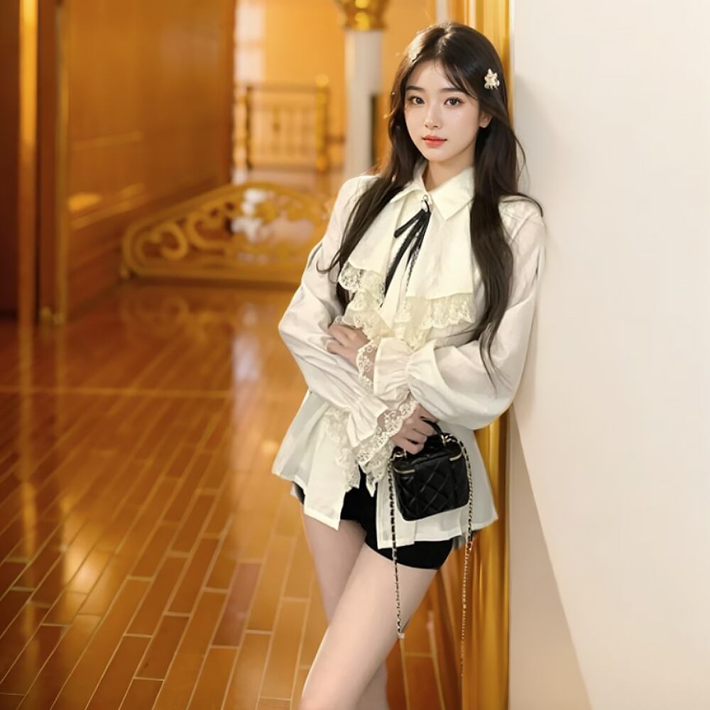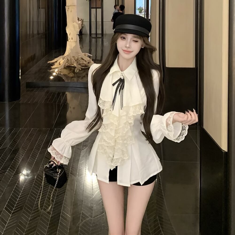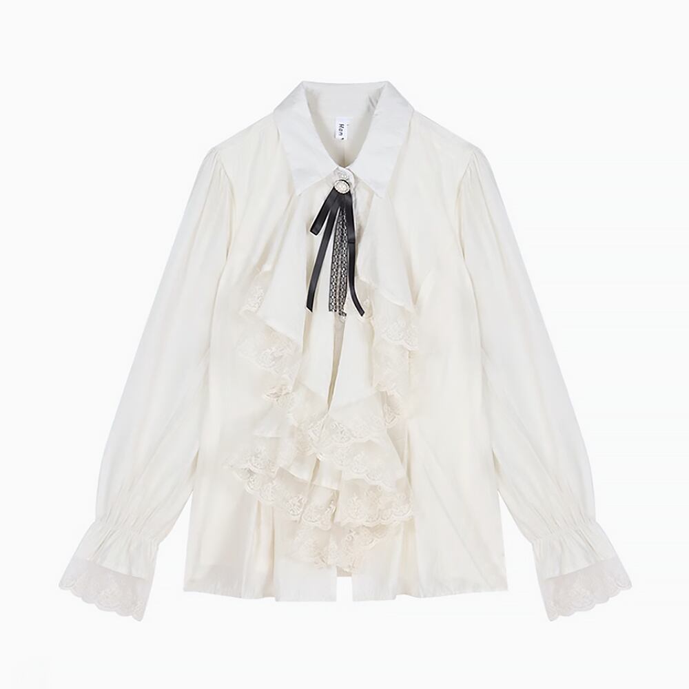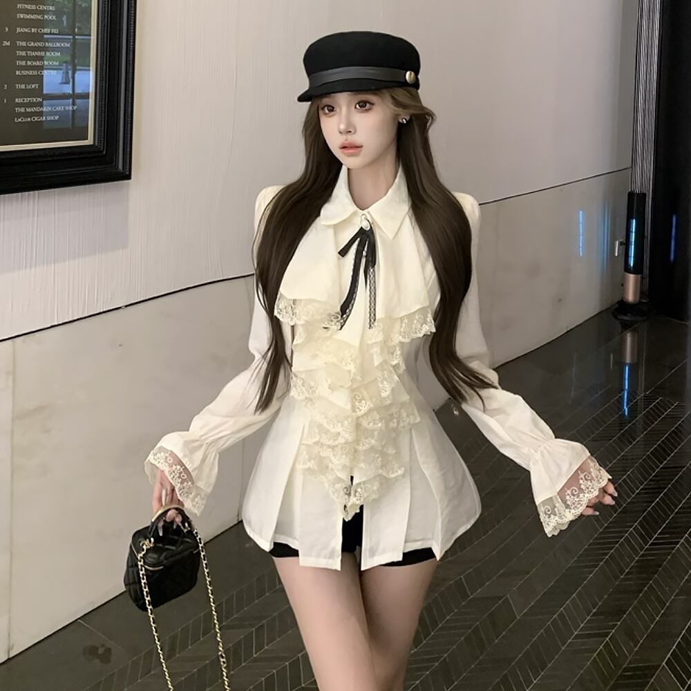 シャボタイ付きレースブラウス シャボタイ フリルタイブラウス フリルタイ ボリュームタイ パーティ デート ゴスロリ ロリータ リボンタイブラウス ダブルチュール ふんわり袖 スカラップ アイボリー アプリコット ホワイト ブラウス パールボタン パフスリーブ ゆったり 袖口大きめリボン リボン 萌袖 長袖 シャツブラウス フェミニン カジュアル かわいい 大人可愛い 大人 おしゃれ レディース デート お出かけ お呼ばれ 着回し モテ 韓国コーデ 韓国ファション