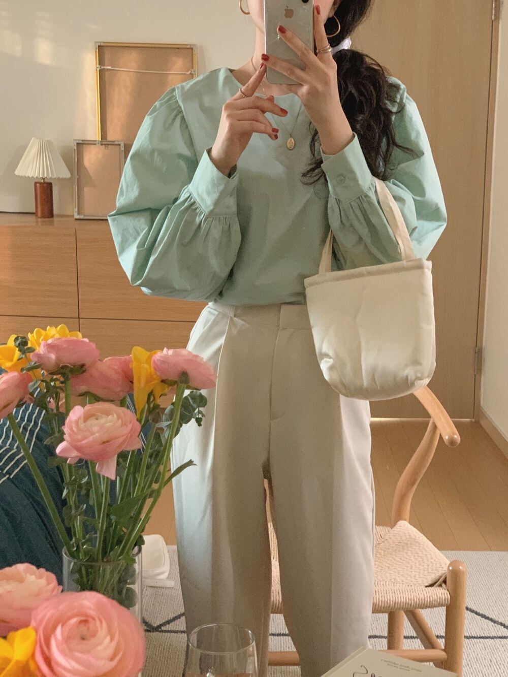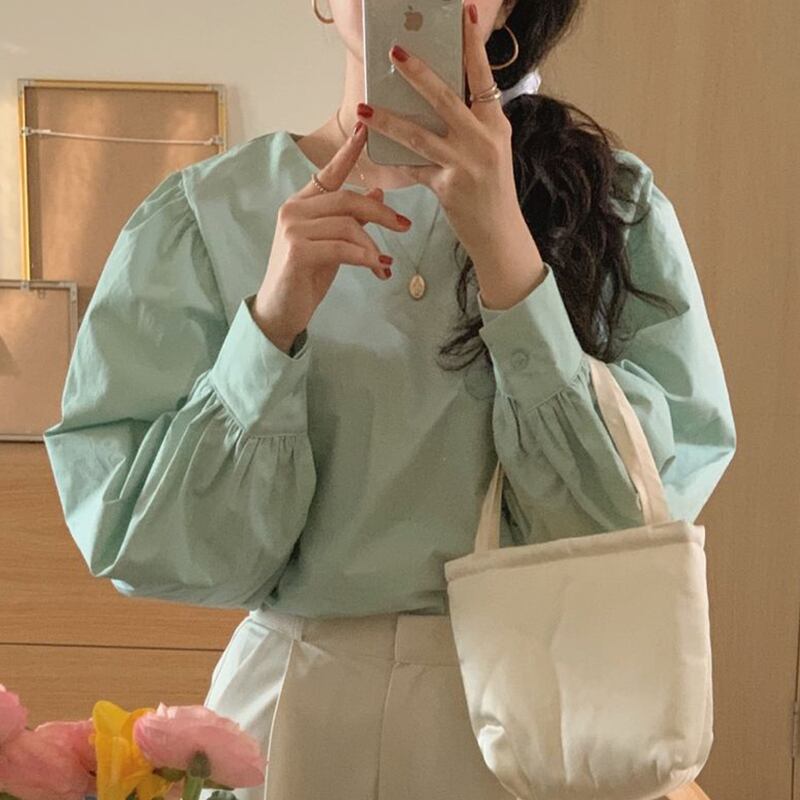 全3色 ラウンドネックカジュアルベーシックブラウス ブラウス シャツ プルオーバー シンプル 長袖 ボリューム袖 パフスリーブ フレアスリーブ フレンチスリーブ ホルンスリーブ 萌袖 ラウンドネック クルーネック ワイド かわいい 大人可愛い きれいめ シンプル カジュアル 上品 おしゃれ お洒落 かっこいい レトロ 大人女子 こなれ感 ラブリー キュート ガーリー 個性的 モード系 エレガント モダン 主役級 存在感 抜け感 無地 レディース 韓国コーデ 韓国ファッション 緑 白 オフホワイト