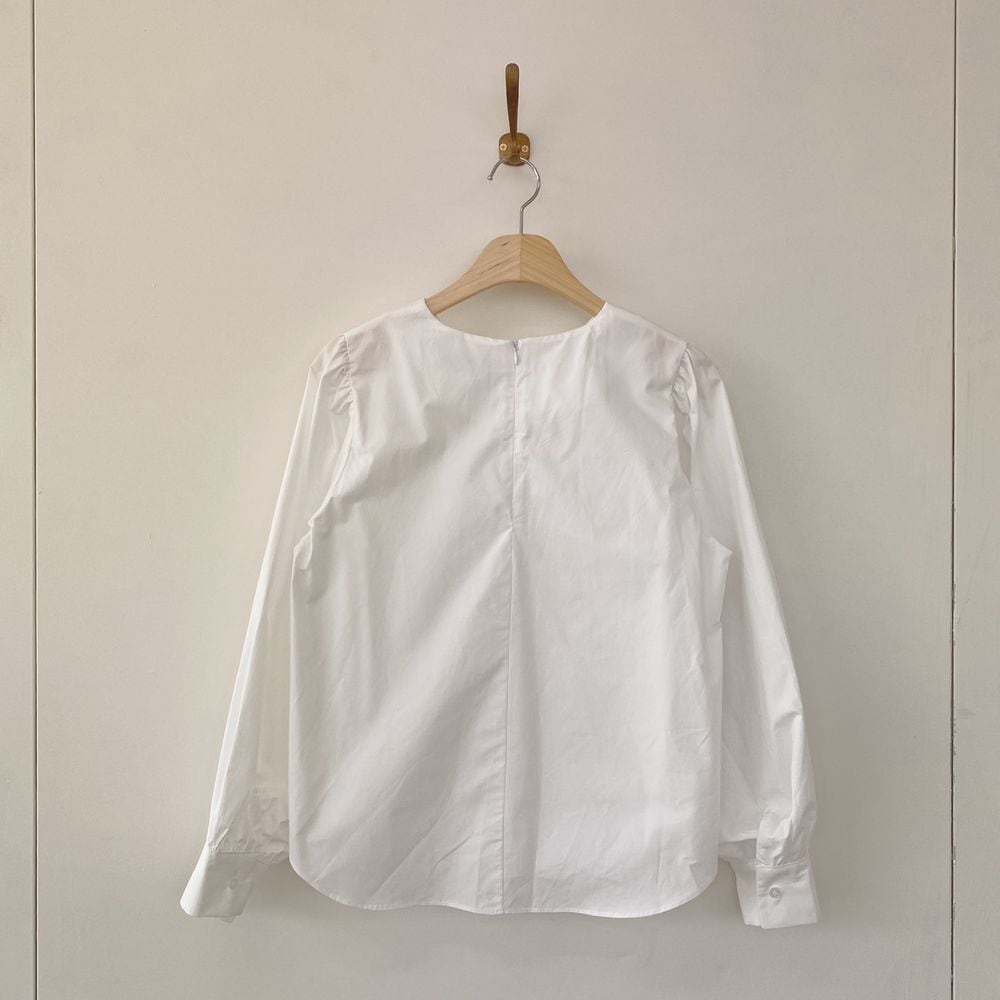 柔らかい色味が特徴的なボリューム袖ブラウスです。