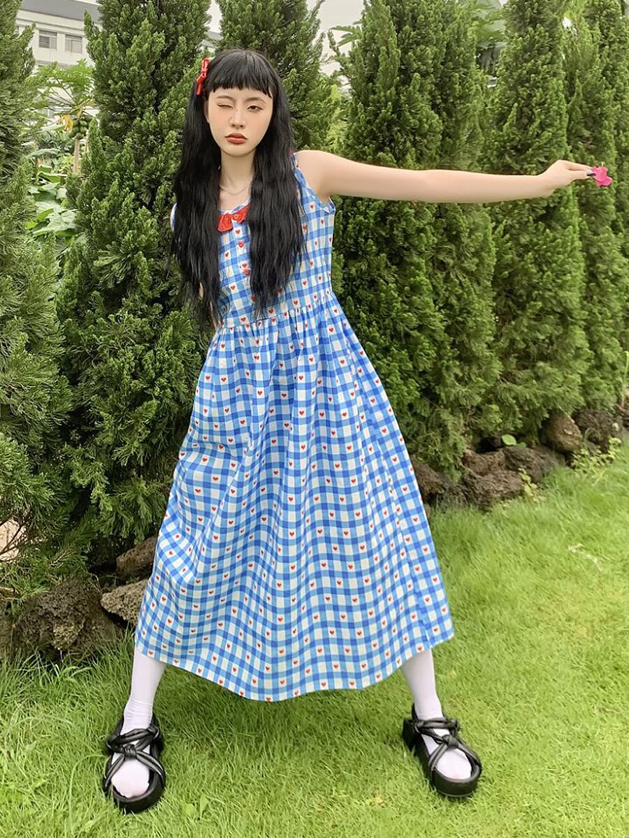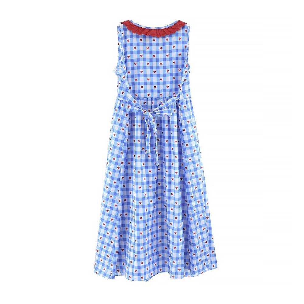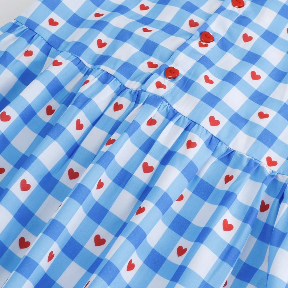 ブルーのチェックの中にハートが隠れていくポップな夏ワンピースです。