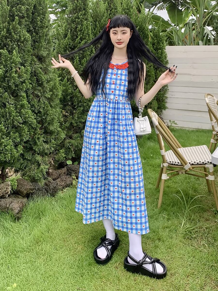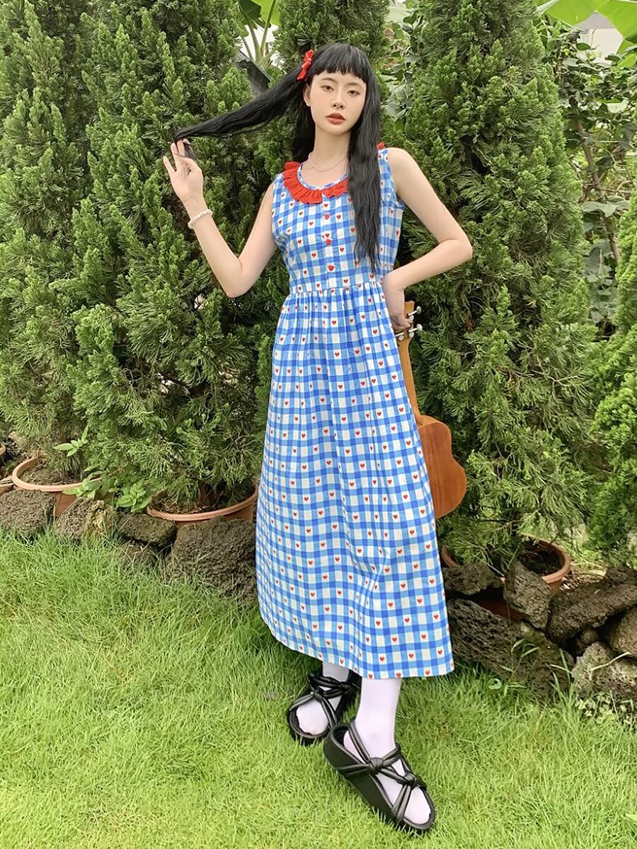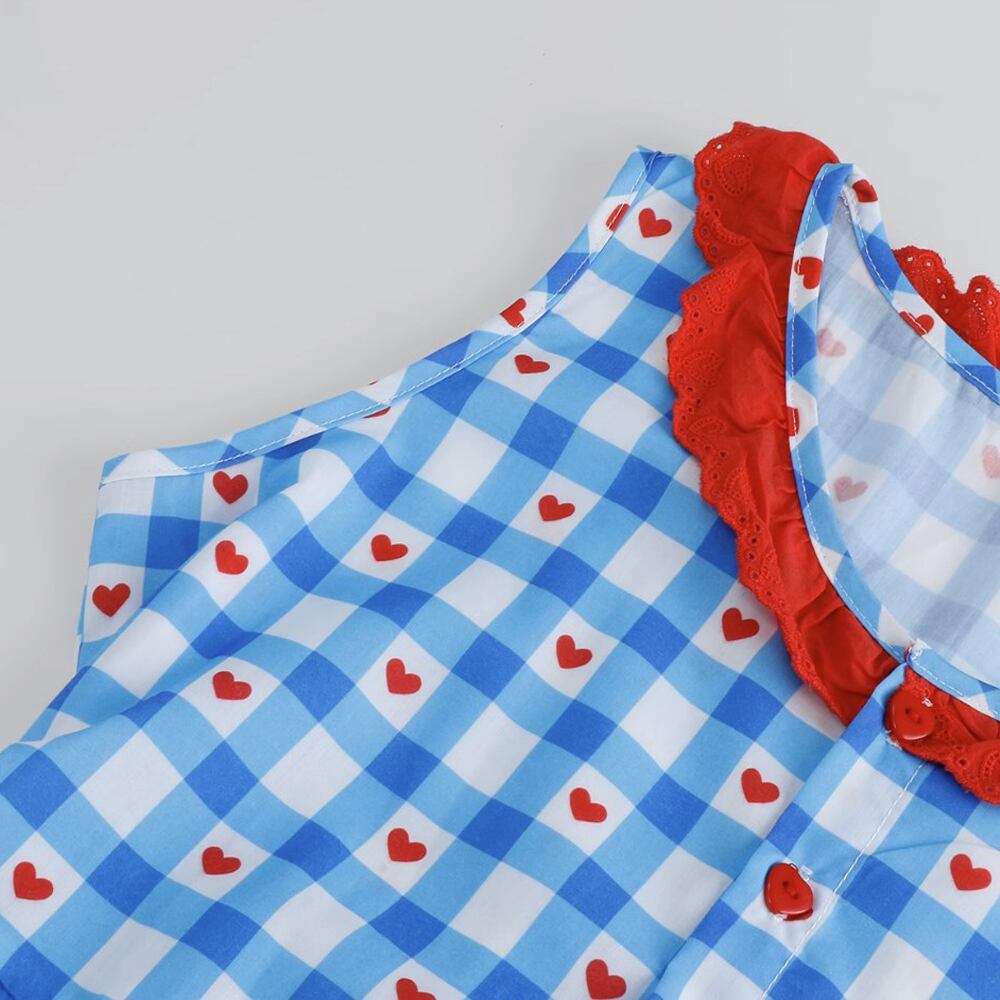 ノースリーブハートチェックワンピース レース フレアワンピース バックリボン 後ろリボン チェック柄 襟ぐりフリル ノースリーブ Aライン ウエスト楽ちん ウエスト切り替え ノースリーブ 夏ワンピース ラウンドネック 襟なし フレア 切り替えデザイン シャーリング ハートボタン ポップ かわいい カラフル 原宿系 カジュアル おしゃれ お洒落 かっこいい レトロ ラブリー キュート ガーリー インスタ映え 韓国コーデ 韓国ファッション 青 赤