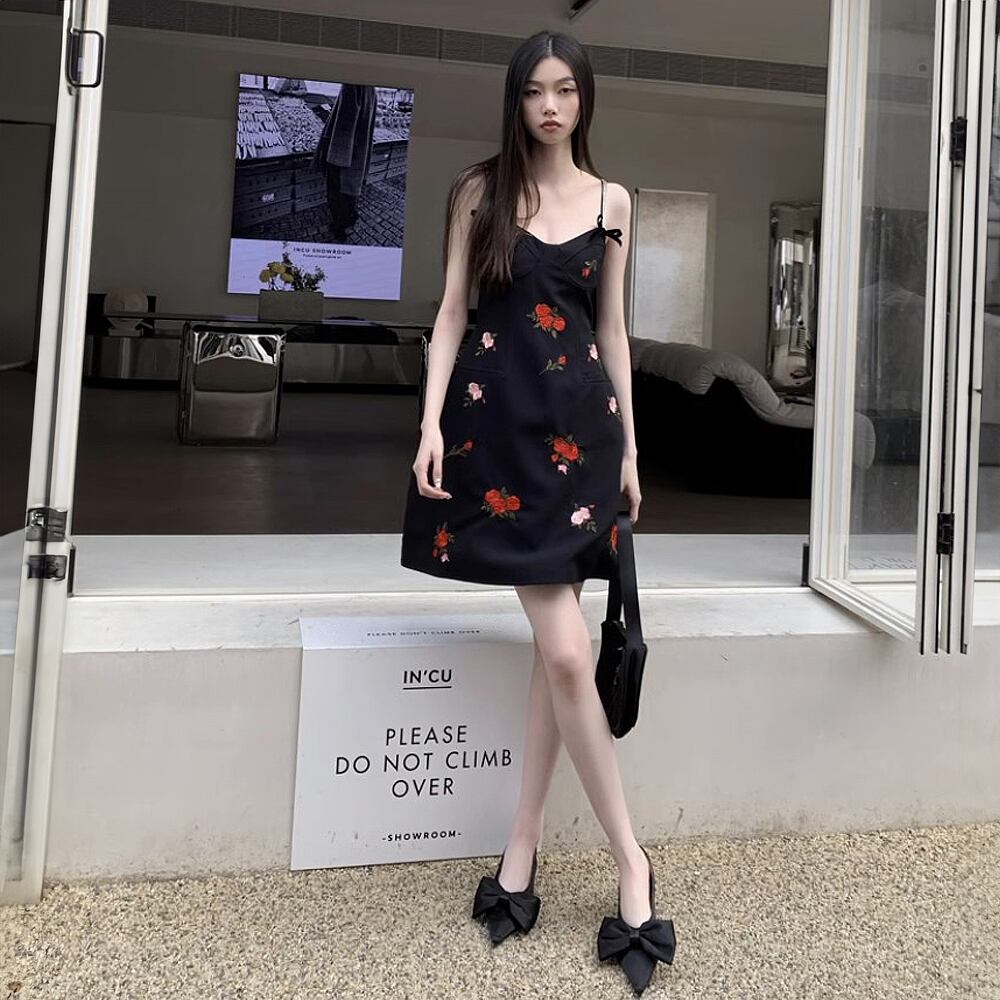 ミニ薔薇キャミソールワンピース キャミワンピ 夏ワンピ 大人の花柄 薔薇の刺繍 刺繍 ミニ丈 ミニ薔薇 小さいバラ ワンピース 膝上 肩紐キラキラ キラキラ ビジューストラップ キラキラストラプ コクーン ドレス バラのドレス スリップドレス 大人可愛い きれいめ 個性的 ノースリーブミニドレス カジュアル 上品 おしゃれ お洒落 かっこいい レトロ 大人女子 こなれ感 ラフ ラブリー キュート 韓国コーデ 韓国ファッション 黒