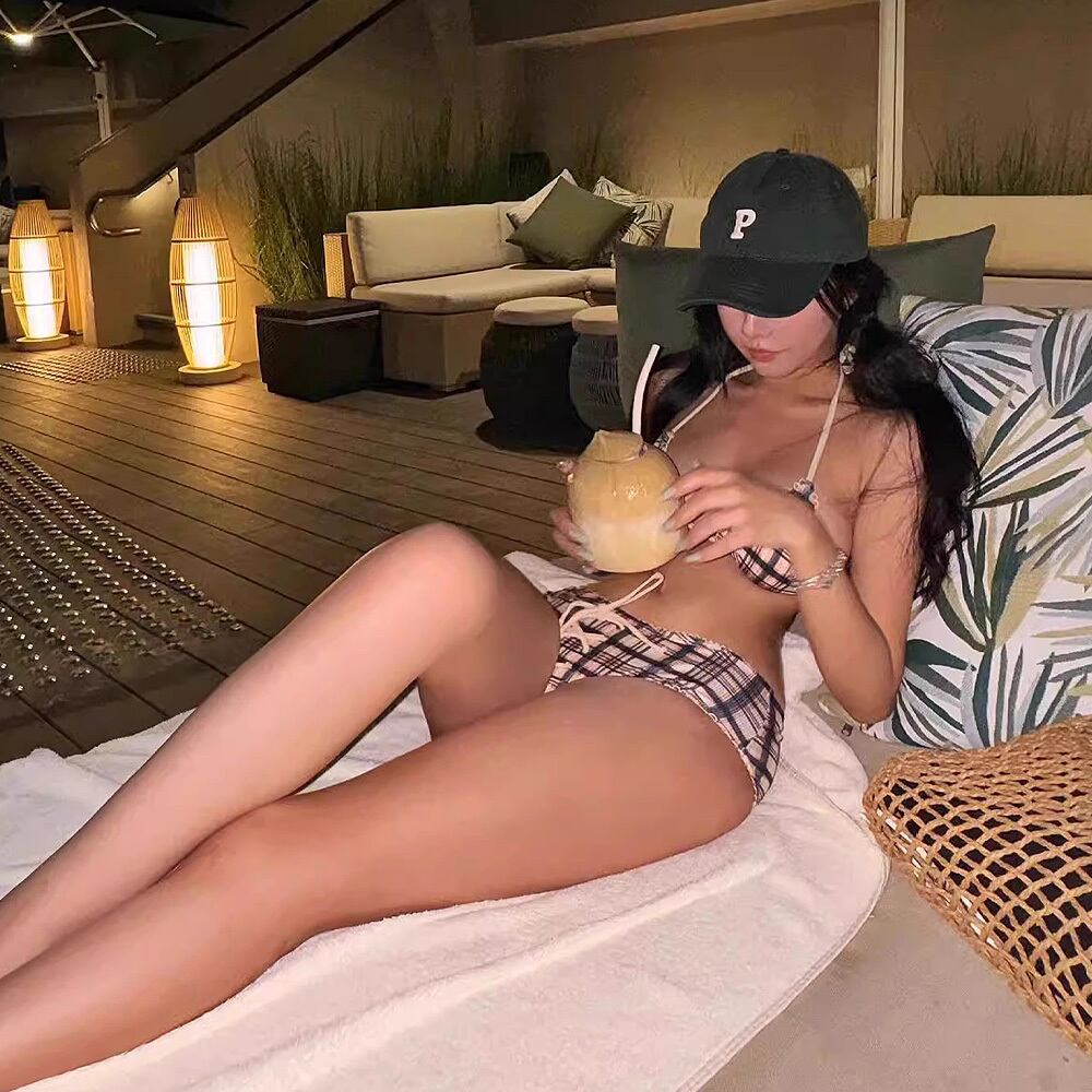 レトロ感のあるタータンチェック柄のホルターネックビキニです。
