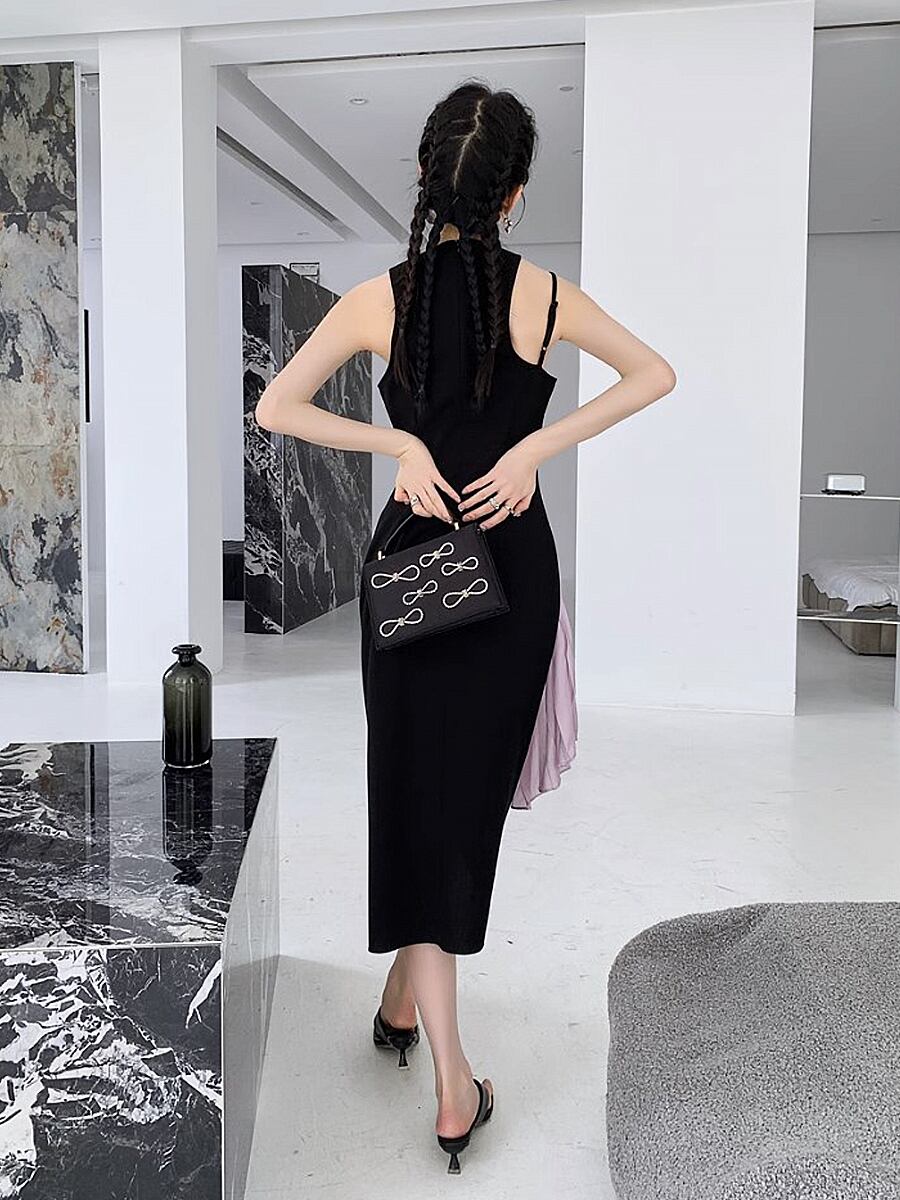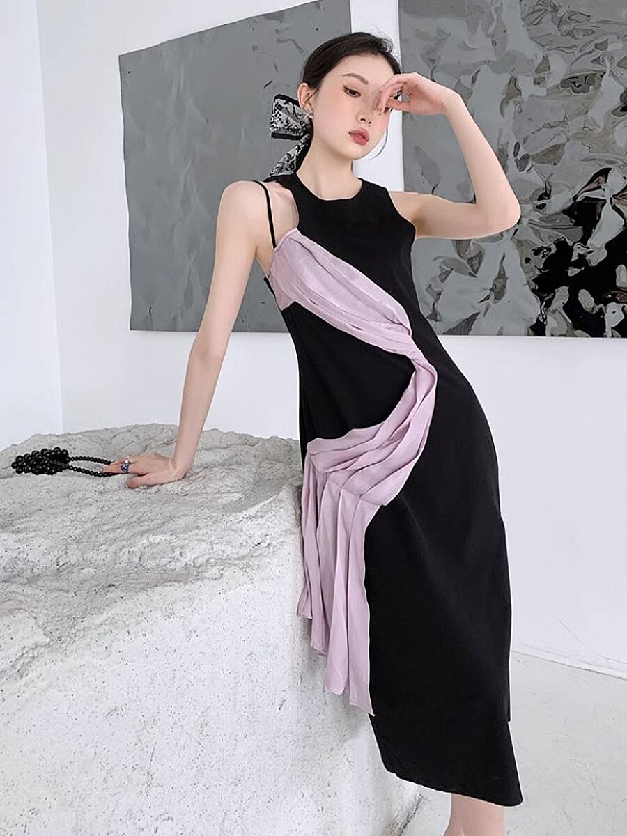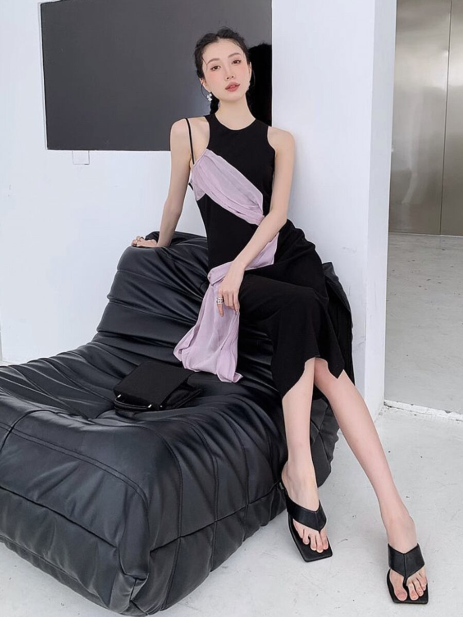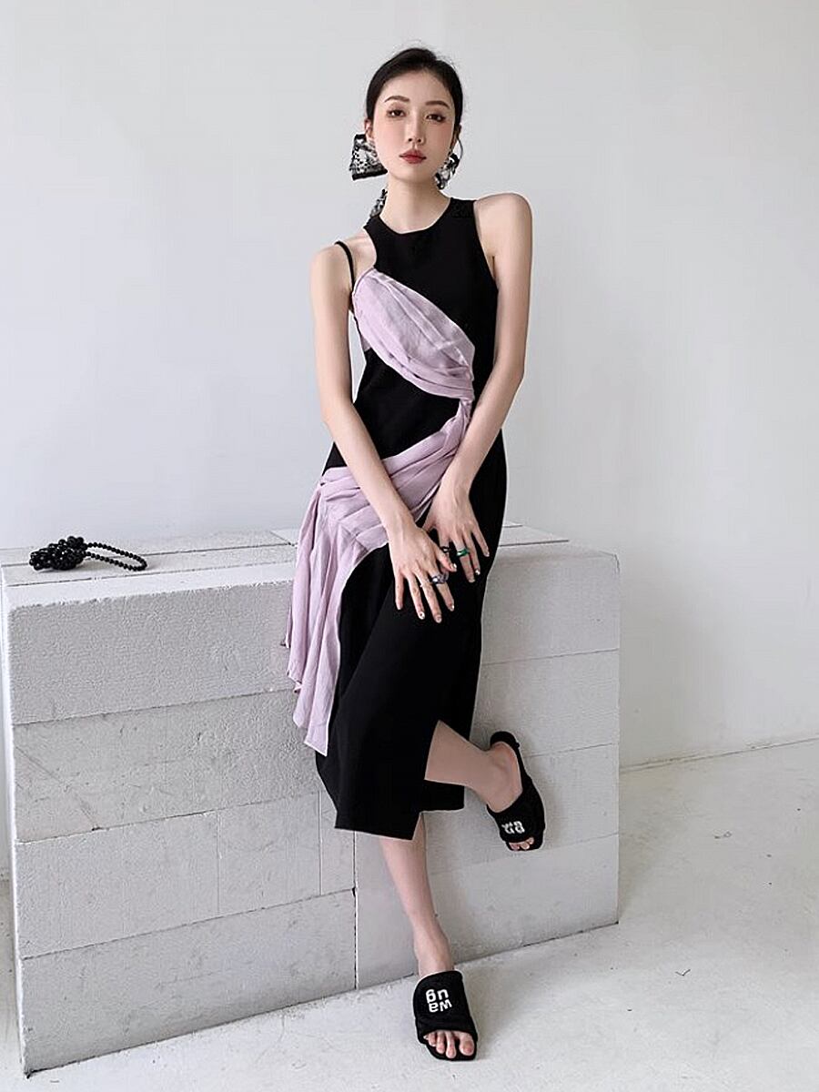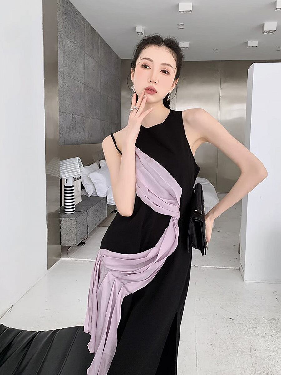 アシメントリーノースリーブワンピース ドレープ ワンピドレス ドレス ロング アメリカンスリーブ風 片側ストラップ バイカラー サイドスリット シースドレス セミフレア ストレート 切り替えデザイン ドッキング 後ろファスナー かわいい 大人可愛い きれいめ 上品 おしゃれ レトロ 大人女子 こなれ感 個性的 モード系 エレガント モダン 韓国コーデ 韓国ファッション 黒 紫 ブラック パープル