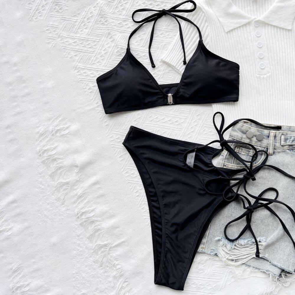 水着 ホルターネックサイドタイアップビキニ ビキニ タイアップ セクシービキニ ホルターネック フロントゴールドビーズ パット付き シンプル ハイウエスト トリプルリボン 胸元 かわいい セクシー 大人可愛い おしゃれ お洒落 主役級 ラブリー キュート ガーリー 無地 ブラック 10代 20代 30代 レディース 海 ビーチ プール リゾート ハイウエスト 美脚 脚長 着痩せ 韓国系 オルチャン ブラック 黒