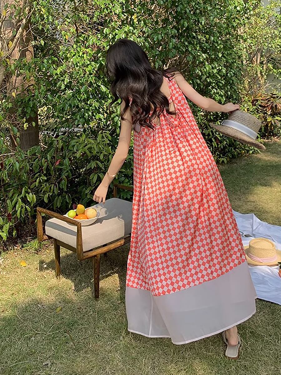チェック柄ノースリーブバックカットワンピース ワンピース 背中開き バックコンシャス バックカット 背中リボン リゾートワンピース レッド 赤 裾シアー 裾透け感 フレア ギャザー シャーリング フリル 夏ワンピース Uネック 背中見せ ロング ロングワンピース マキシ ふんわり ふわふわ レトロ柄 オシャレ 大人女子 こなれ感 ラブリー キュート エレガント モダン 主役級 とろみ感 抜け感 お出かけ 韓国コーデ 韓国ファッション