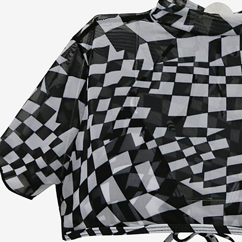 黒と白のブロックチェックのビキニ上下と透け感のあるオーバートップスの3点セットです。