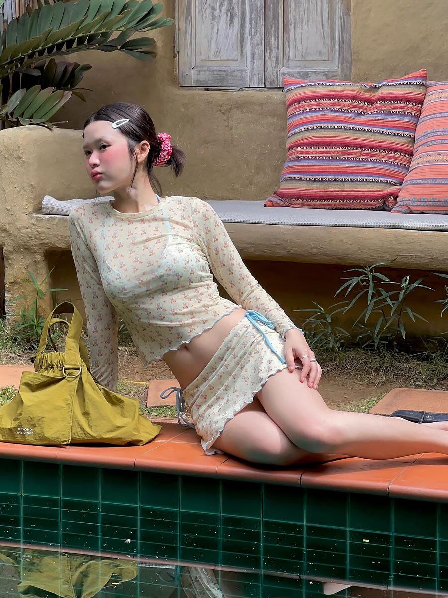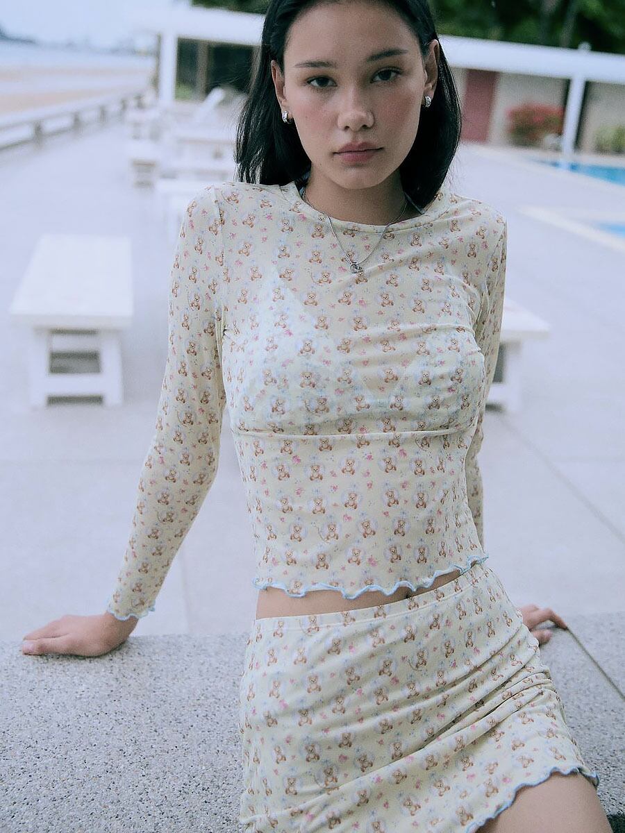クマ模様プリントのホルターネックビキニ上下と長袖プルオーバーにミニスカートの4点セットです。