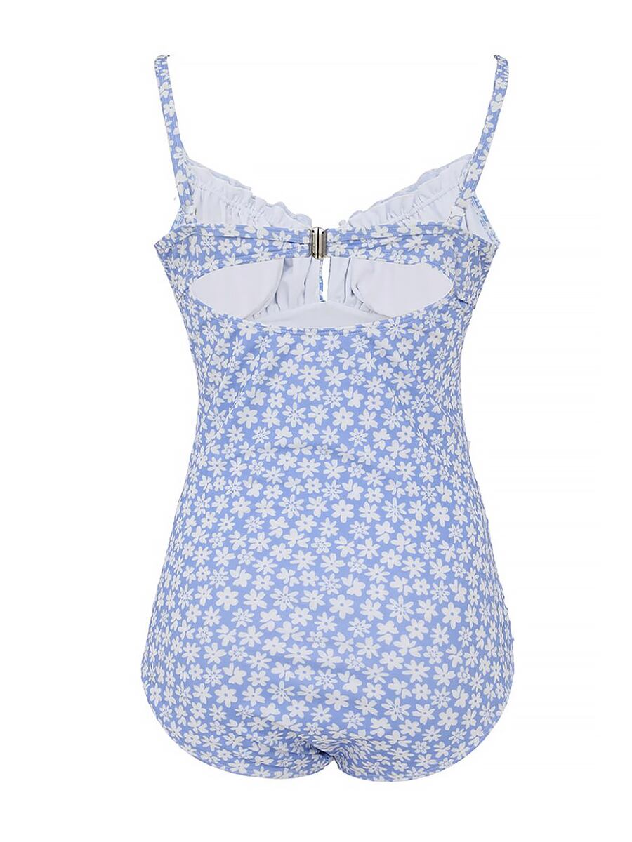 水着 ワンピース 花柄 小花柄 花模様 ガーリー リボン 露出控えめ 露出少なめ スイムウェア 胸元フリル シャーリング バックシャン バックコンシャス パッド付き ワイヤーなし レトロ モダン フェミニン セクシー シンプル 大人 おしゃれ お洒落 女っぽ 個性的 レディース ホテル 温泉 海 ビーチ プール リゾート 旅行 着痩せ スタイルアップ 美スタイル 韓国 韓国系 オルチャン 韓国コーデ 韓国ファッション 青 ブルー