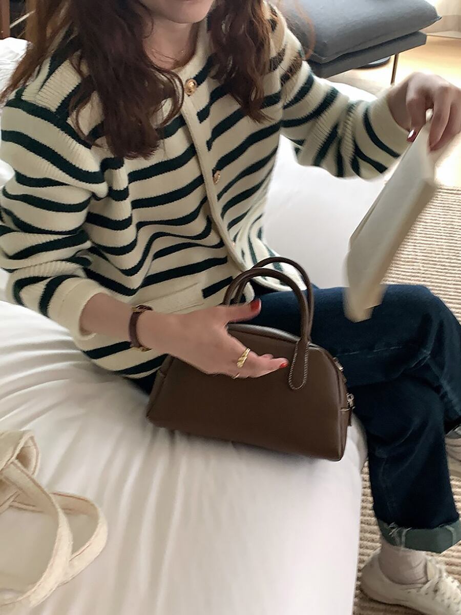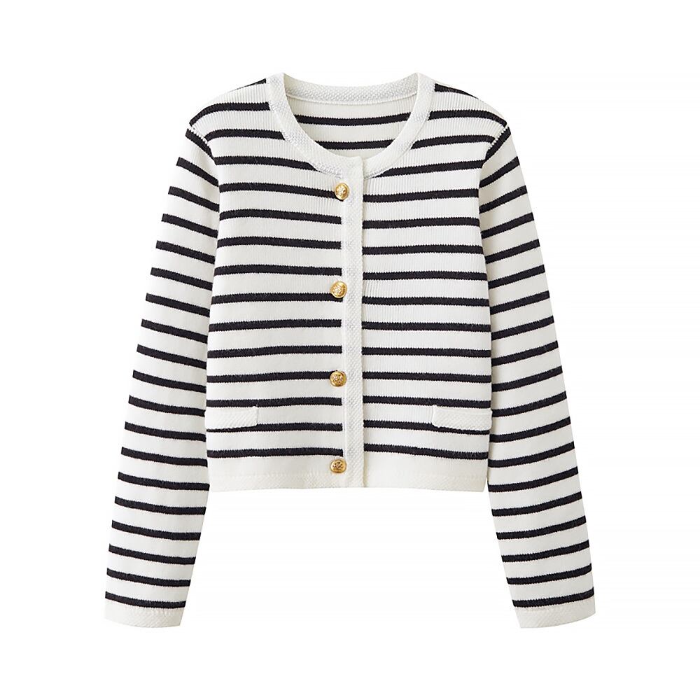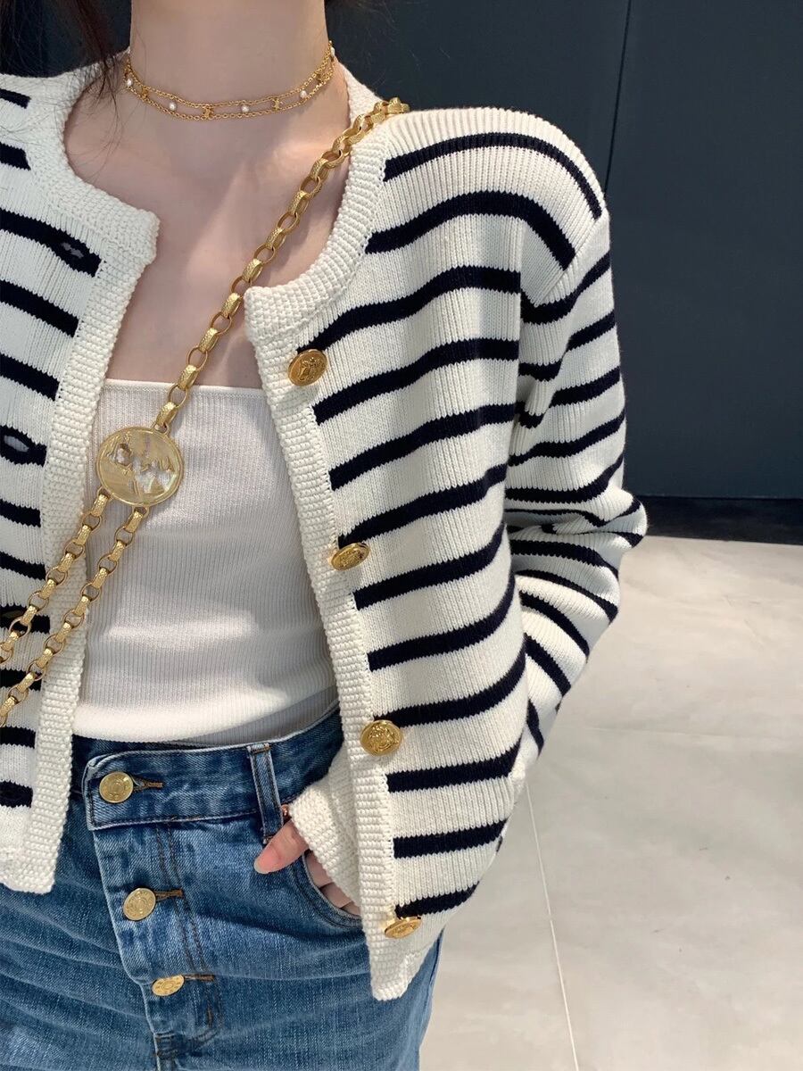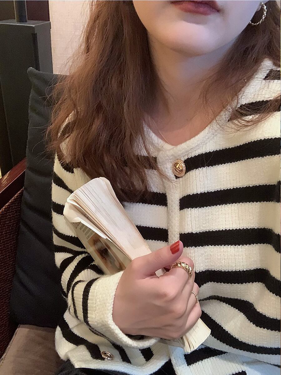 全2色 長袖ボーダーカーディガン 長袖 ボーダー ストライプ ニットトップス ソフトセーター ルーズ エレガント ヴィンテージ風 ゴールドボタン 金ボタン ポケットあり カーディガン かわいい 大人可愛い きれいめ シンプル カジュアル 大人 上品 おしゃれ こなれ感 ラブリー とろみ感 大人エレガント 美しい ストライプ レディース 学生 デート お出かけ 公園デビュー 休日 普段使い モテ 韓国コーデ 韓国ファション 緑 黒 白
