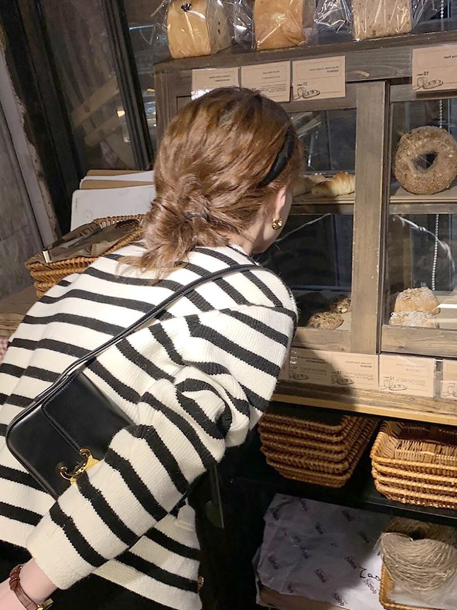 ゴールドに輝くパールボタンがコーデにアクセントをつけてくれます。