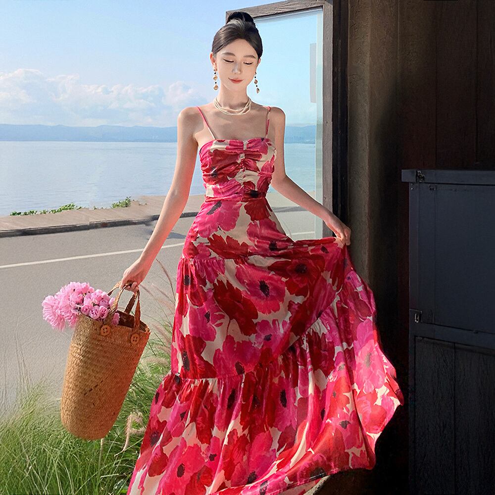 レッド花柄ロングリゾートワンピースドレス ワンピース ドレス キャミワンピ キャミソールワンピース サマーワンピ 夏ワンピ リゾートワンピース 花柄ワンピース 花柄 マキシ だんだんフリル ロング ティアード ティアードワンピ 旅行 バカンス 海外旅行 ゆったり 楽ちん 上品 オシャレ 大人女子 こなれ感 ラブリー キュート 体型カバ ルーズ エレガント モダン 主役級 とろみ感 抜け感 お出かけ 花柄 韓国コーデ 韓国ファッション 赤 レッド オレンジ