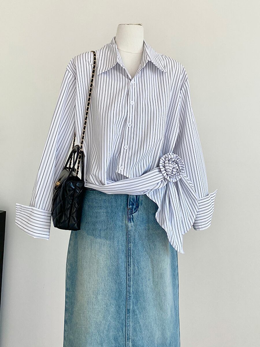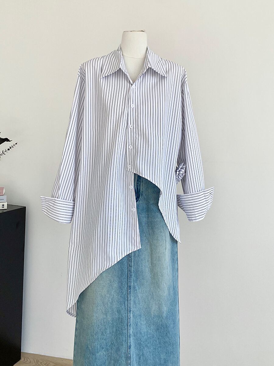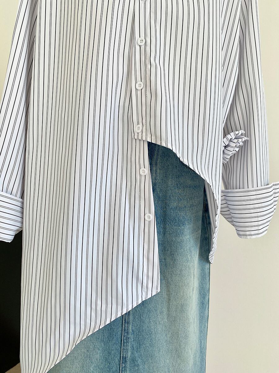 サイド裾留めストライプブラウス 袖あり 長袖 襟付き ストライプ シャツブラウス ウエスト絞り ウエストマーク アシンメトリー 裾横留め かわいい 大人可愛い きれいめ シンプル カジュアル 上品 おしゃれ お洒落 かっこいい レトロ 大人女子 こなれ感 ラフ ラブリー キュート ガーリー 個性的 クール モード系 エレガント モダン 主役級 存在感 抜け感 柄 ストライプ 韓国ファッション 韓国コーデ 白 ホワイト