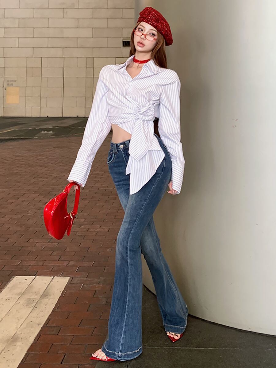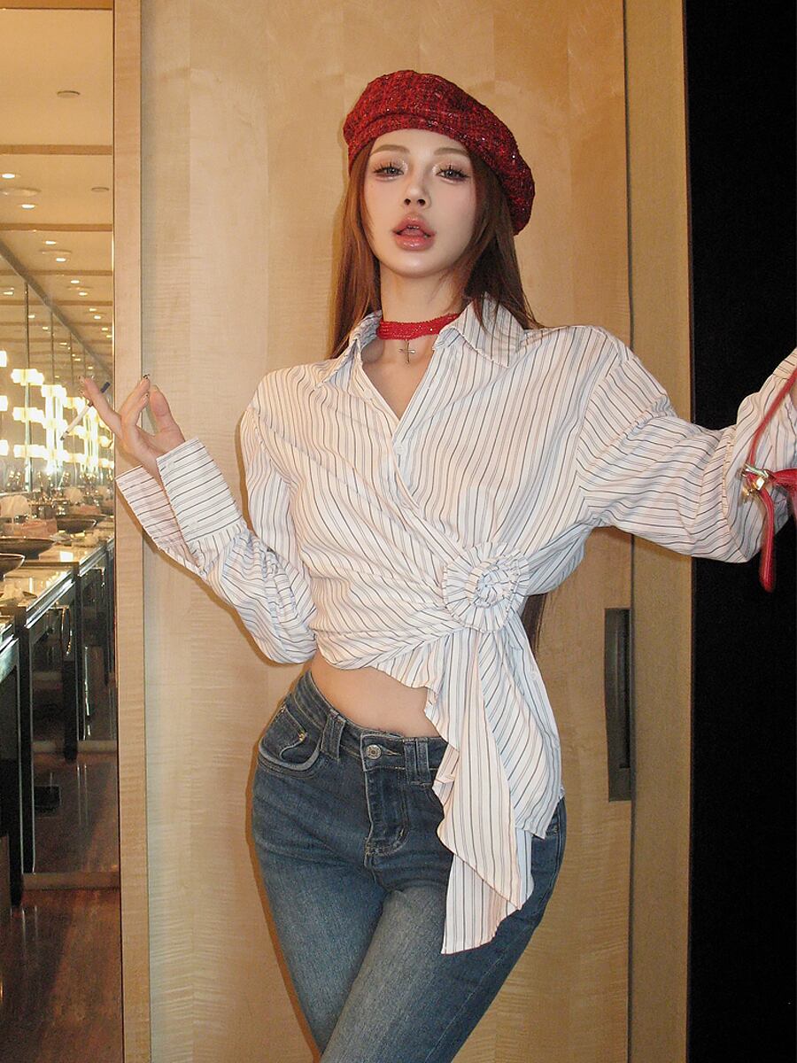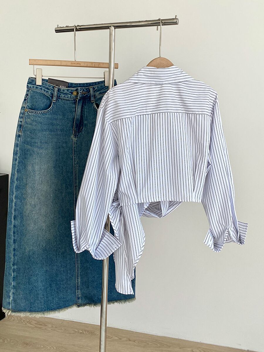 サイド裾留めストライプブラウス 袖あり 長袖 襟付き ストライプ シャツブラウス ウエスト絞り ウエストマーク アシンメトリー 裾横留め かわいい 大人可愛い きれいめ シンプル カジュアル 上品 おしゃれ お洒落 かっこいい レトロ 大人女子 こなれ感 ラフ ラブリー キュート ガーリー 個性的 クール モード系 エレガント モダン 主役級 存在感 抜け感 柄 ストライプ 韓国ファッション 韓国コーデ 白 ホワイト