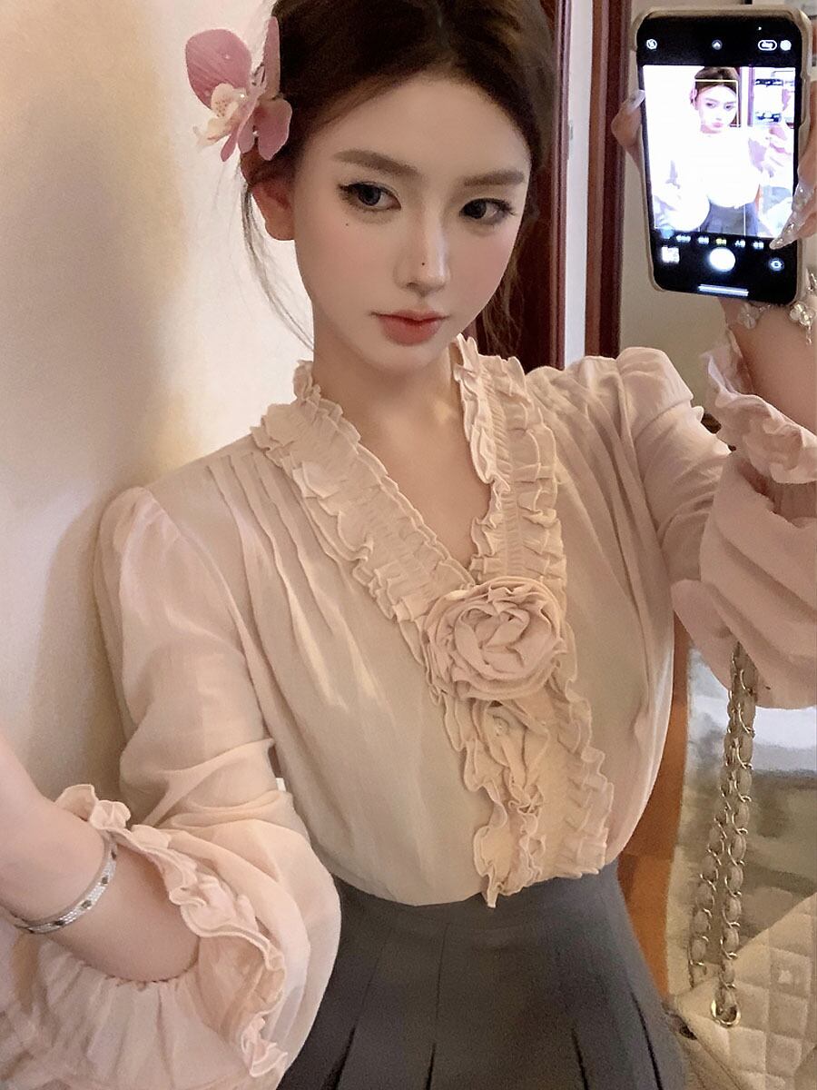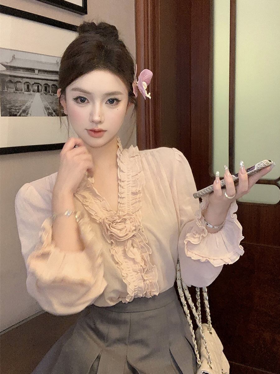 くすみピンクVネックラッフルカフルブラウスプルオーバー 長袖 萌袖 ランタンスリーブ バブルスリーブ Vネック シャツブラウス かぶるタイプ プルオーバー かわいい 大人可愛い きれいめ シンプル カジュアル きちんと感 大人 上品 おしゃれ 大人女子 こなれ感 キュート 個性的 主役級 存在感 フォーマル 無地 春 秋 レディース 通勤 学生 通学 デート 普段使い 重ね着 大人カラー モノトーン 韓国コーデ 韓国ファッション ピンク くすみピンク ダスティピンク モープピンク