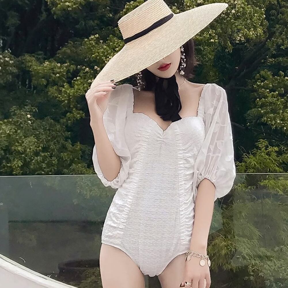 ふんわりとした袖ののシフォン素材が大人キュートなワンピース水着です。