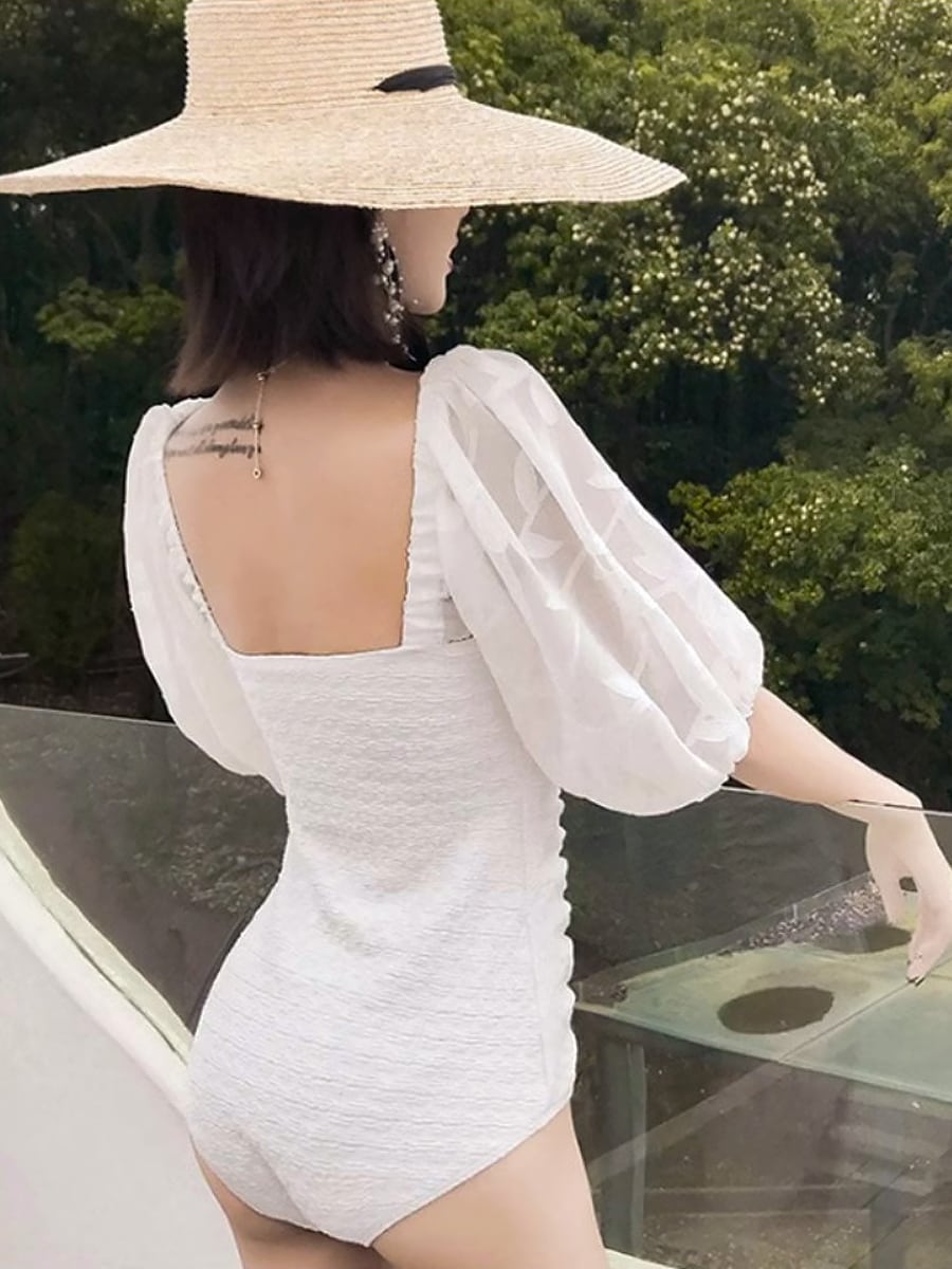 水着 袖付きハートシェイプネックレースワンピース ワンピース水着 パッド付き ワイヤーあり 袖レース 透け感 シャーリング リーフ模様レース シアースリーブ シースルースリーブ 透け感袖 かわいい 大人可愛い きれいめ バックシャン ホワイト 白 華やか 大人 おしゃれ ラブリー キュート スタイリッシュ かっこいい レディース ビーチ プール リゾート 旅行 体系カバー 美脚 脚長 スタイルアップ 美スタイル 韓国ファッション モテ インスタ映え 韓国コーデ