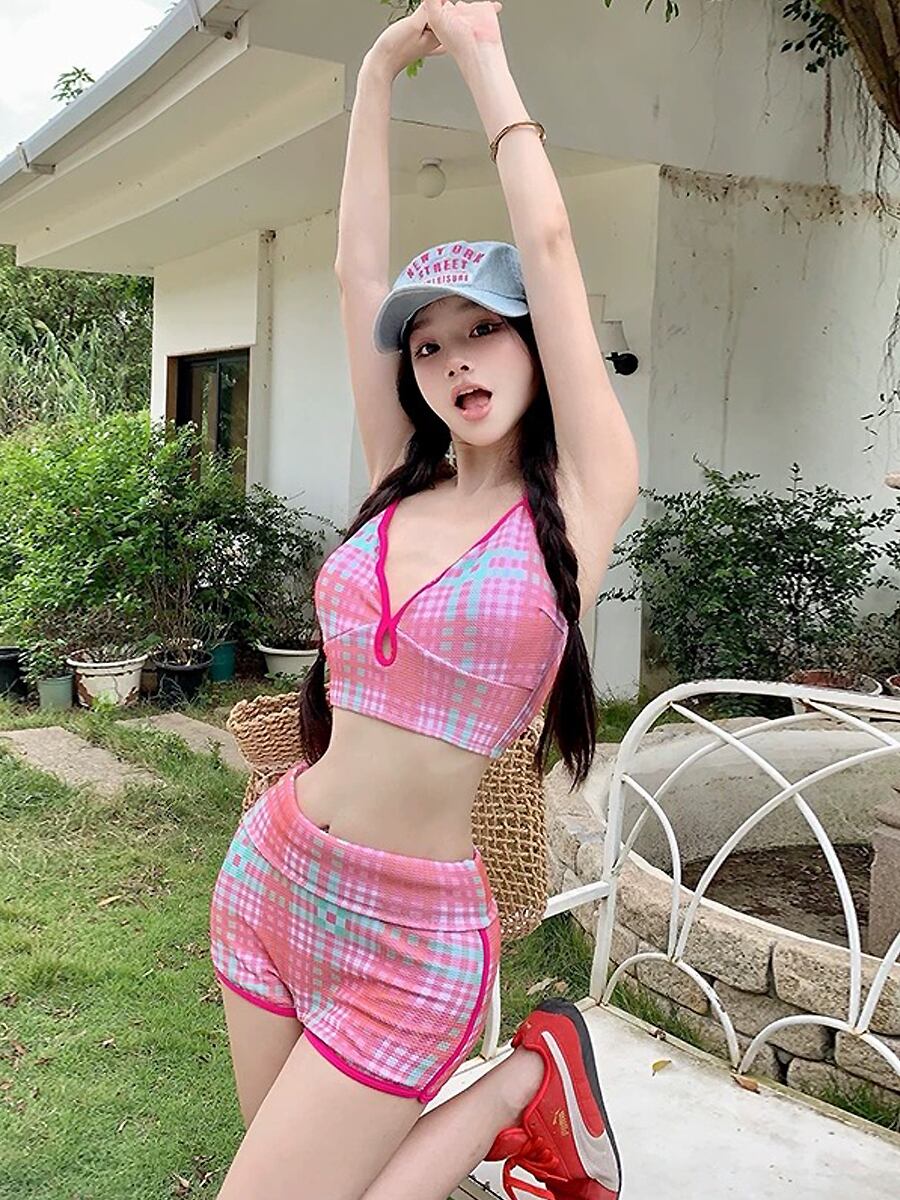 3点セット 水着 ピンクチェックスポーティビキニ上下+長袖ラッシュガード セットアップ ボーイレッグ スポーティ 長袖水着 動きやすい 袖リボン リボン 長袖 ラッシュガード 露出控えめ 露出少ない ピンクリボン 小さめリボン ミニリボン 日焼け止め スポーティ 短パン風 二の腕カバー 日焼け防止 チェック柄風 胸パッド付き ワイヤーなし かわいい 大人可愛い カジュアル 華やか 女っぽ キュート レディース 韓国コーデ 韓国ファッション ピンク ピンク系