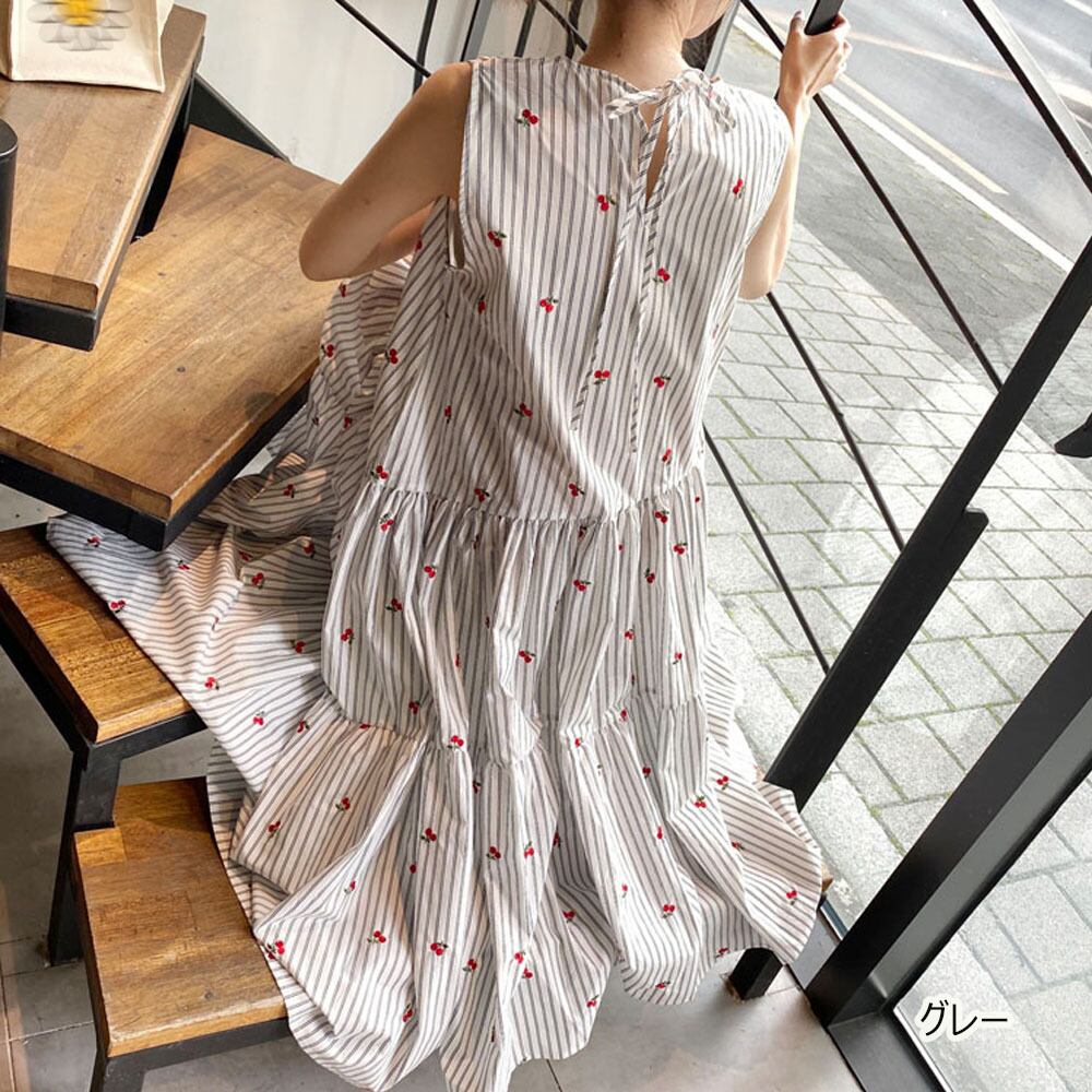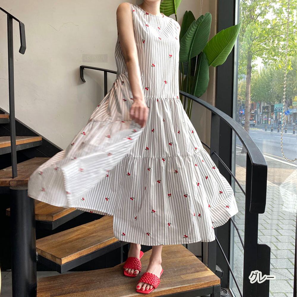 全2色 ノースリーブチェリーストライプワンピース フレアワンピース ミモレ ロング 段々フリル 袖なし ノースリーブ Uネック ラウンドネック ティアード フレア Aライン かわいい 大人可愛い カジュアル おしゃれ コットン 綿 大人女子 こなれ感 ラフ ラブリー キュート ガーリー 柄 春 夏 10代 20代 レディース 学生 通学 デート お出かけ 休日 旅行 海 普段使い お揃い 双子 韓国 韓国系 楽ちん 体系カバー サイズ フリーサイズ グレー ピンク