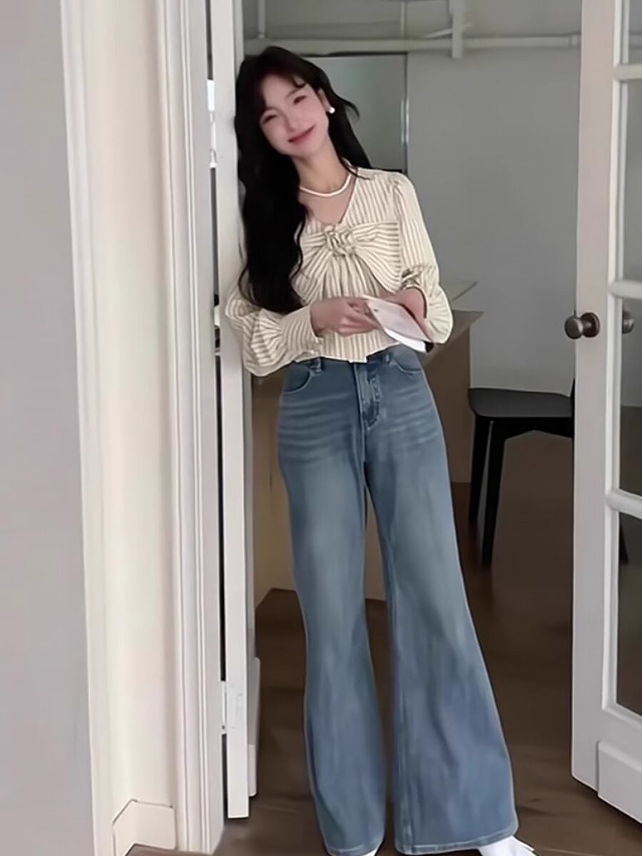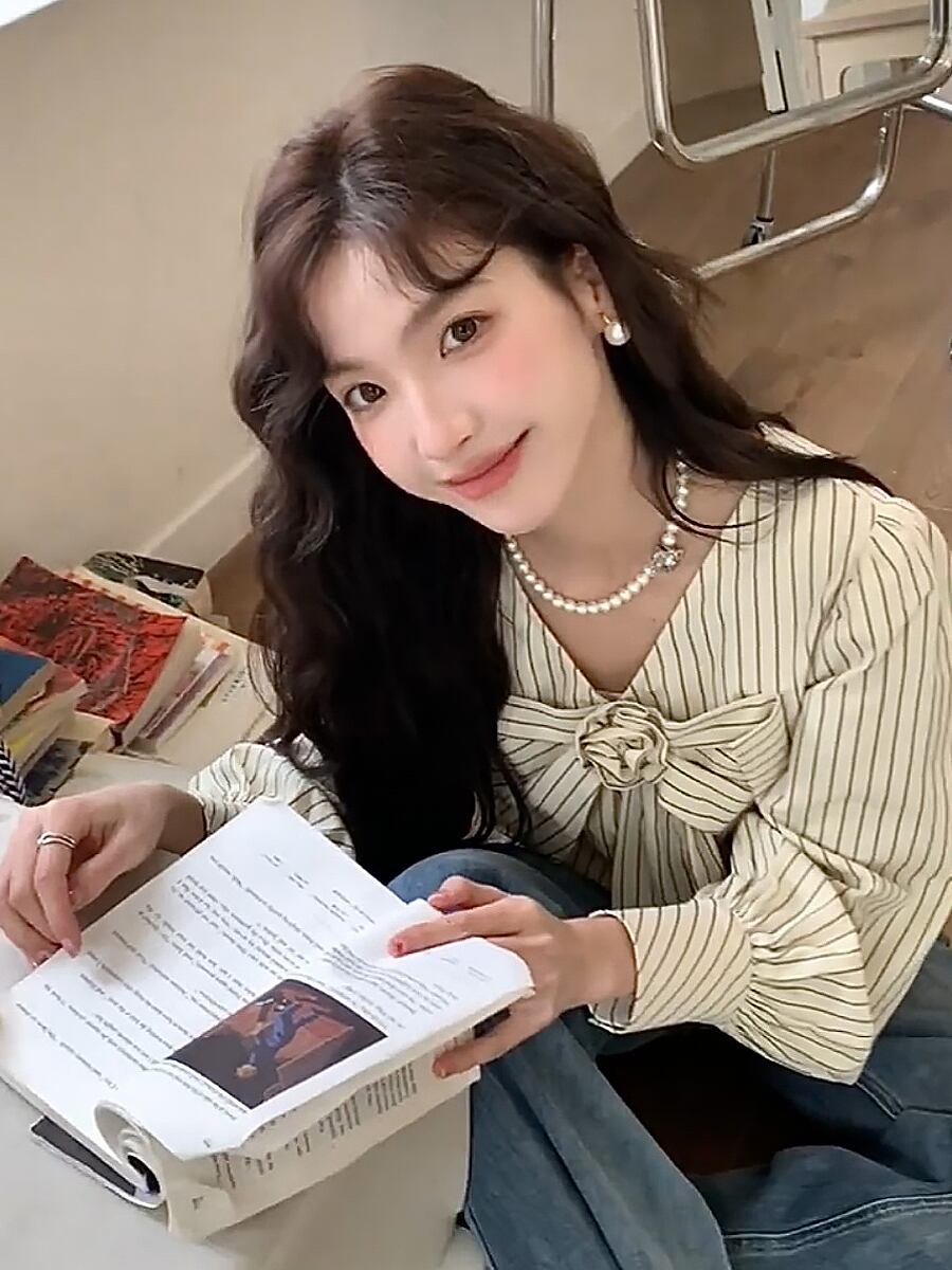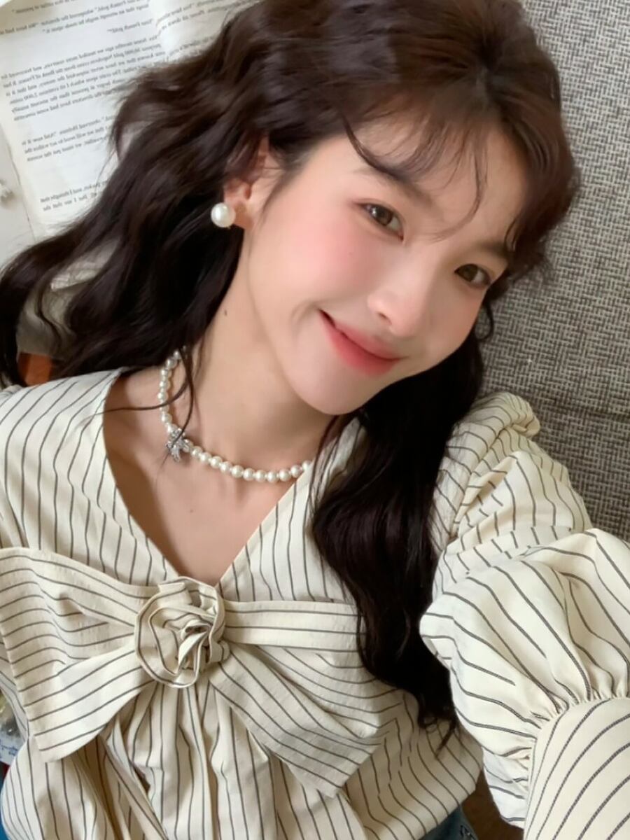 ストライプVネックボウタイ長袖ブラウス アイボリー シャツ ブラウス プルオーバー 大きめリボン ボウタイ リボン お花モチーフ付き お花モチーフ ゆったり感 普段着 通勤 通学 かわいい 可愛い ガーリー 明るめ 春秋 春 秋 きれいめ カジュアル 上品 おしゃれ お洒落 かっこいい 大人女子 こなれ感 ラフ ラブリー キュート 個性的 クール モード系 エレガント モダン 主役級 存在感 抜け感 韓国ファッション 韓国コーデ