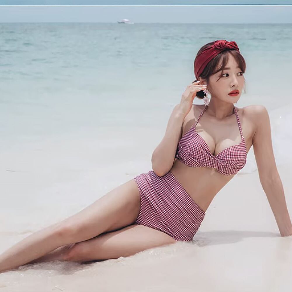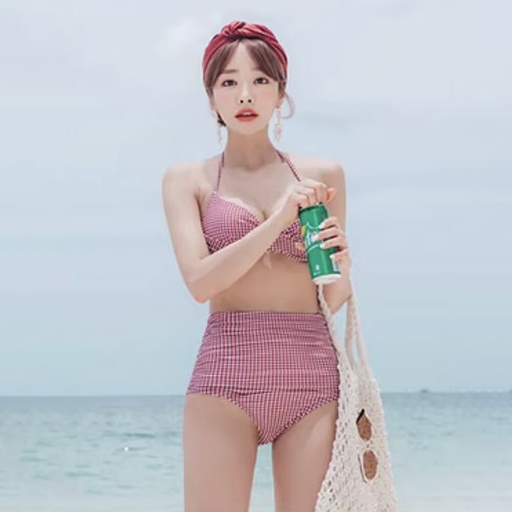体型カバーのかわいい赤チェックのハイウエストビキニです。