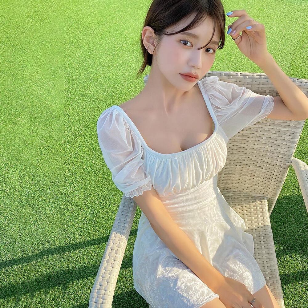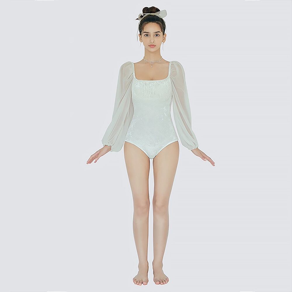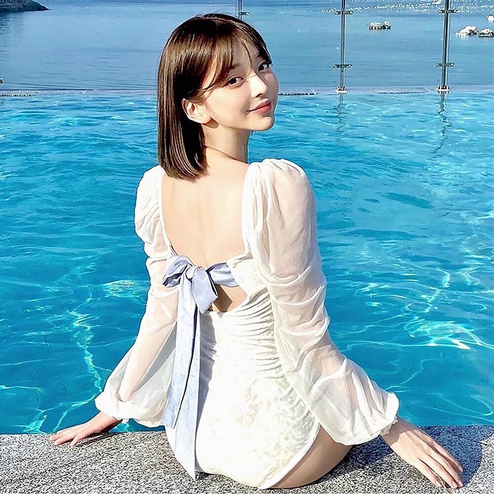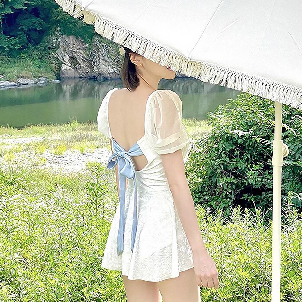 全2種 水着 バックリボン袖ありシャーリングワンピース ワンピース水着 パッド付き ワイヤーなし 質感あり 半袖 長袖 シアースリーブ シースルースリーブ 透け感袖 かわいい 大人可愛い きれいめ 清楚 青リボン ブルー リボン 華やか 大人 おしゃれ ラブリー キュート スタイリッシュ かっこいい レディース ビーチ プール リゾート 旅行 体系カバー 美脚 脚長 スタイルアップ 美スタイル 韓国ファッション モテ インスタ映え 白 韓国コーデ