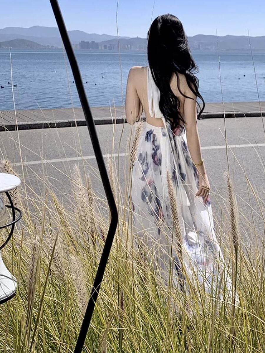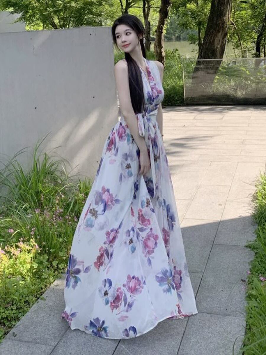 シアーリゾートワンピース ベアバック ホルターネック 背中開き ロングキャミソールワンピース 夏ワンピース 夏ワンピ 花柄 パープル ブルー シフォン フラワープリント ロング 膝下 マキシ バックリボン バッククロスリボン後ろリボン 背中リボ ロングワンピース 袖なし キャミワンピ Aライン かわいい きれいめ セクシーワンピ おしゃれ お洒落 かっこいい レトロ 大人女子 こなれ感 ラブリー キュート ガーリー 個性的 モード系 エレガント モダン 韓国コーデ 韓国コーデ 韓国ファッション