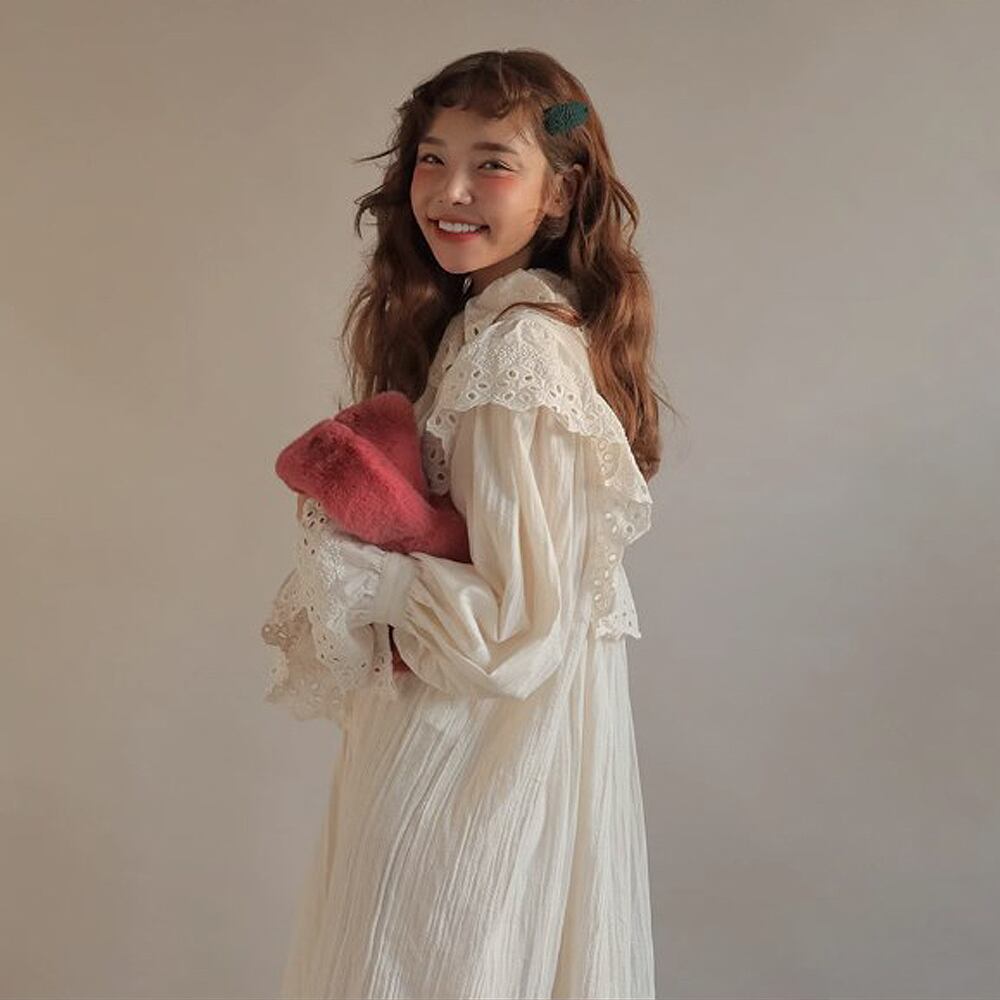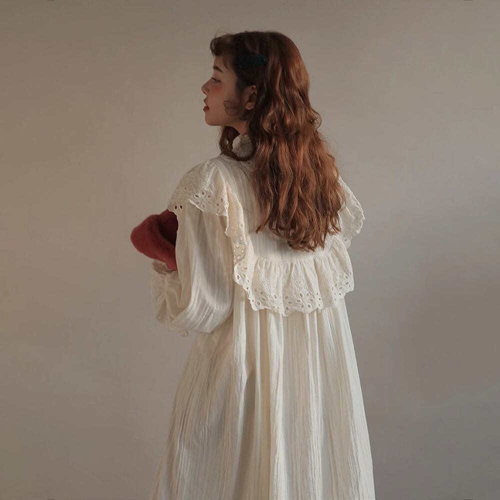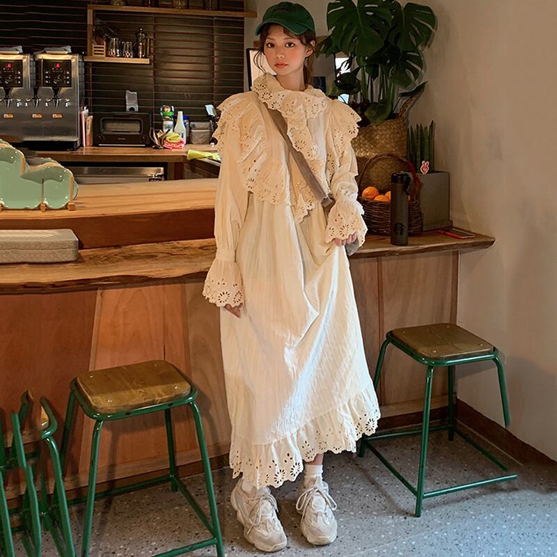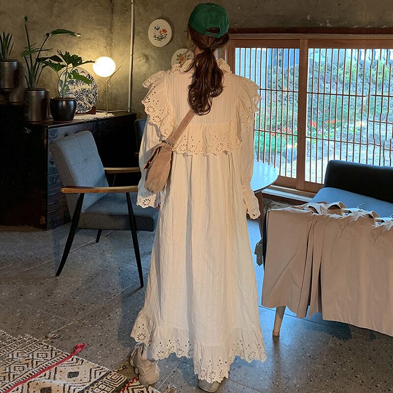 長袖レースワンピース デート 白トップス フレアワンピース ティアードワンピース ワンピドレス ロング ロング丈 マキシ マキシ丈 ミディアム丈 袖あり 長袖 ボリューム袖 パフスリーブ フレアスリーブ フレンチスリーブ ホルンスリーブ 萌袖 襟付き スタンドカラー フレア セミフレア スリム タイト 細身 ストレート Aライン 切り替えデザイン ドッキング プリーツ 刺繍 編み込み かわいい 大人可愛い きれいめ シンプル 上品 おしゃれ お洒落 レトロ 大人女子 こなれ感 ラブリー キュート ガーリー
