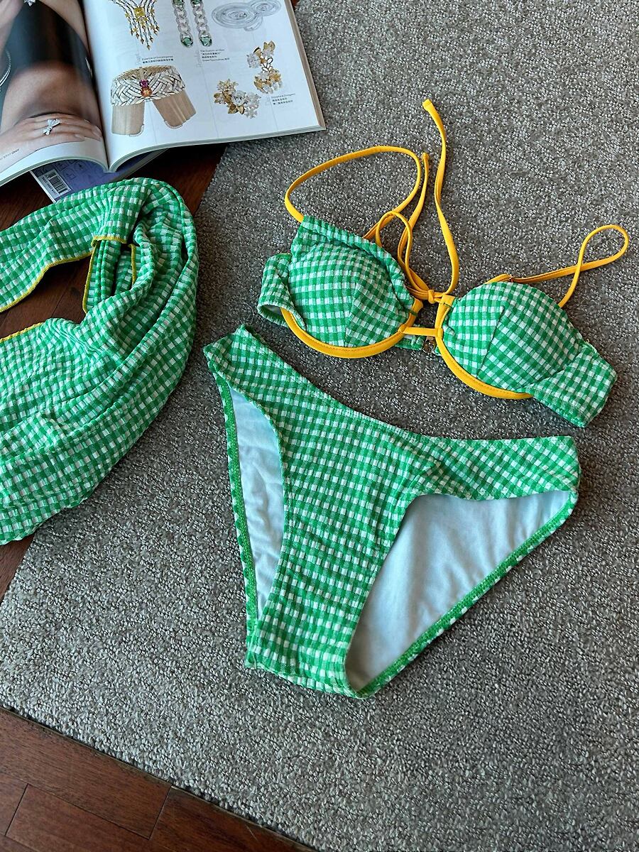 元気いっぱいにみせてくれるライトグリーンとイエロー配色のチェック柄ビキニ上下とパレオの3点セットです。