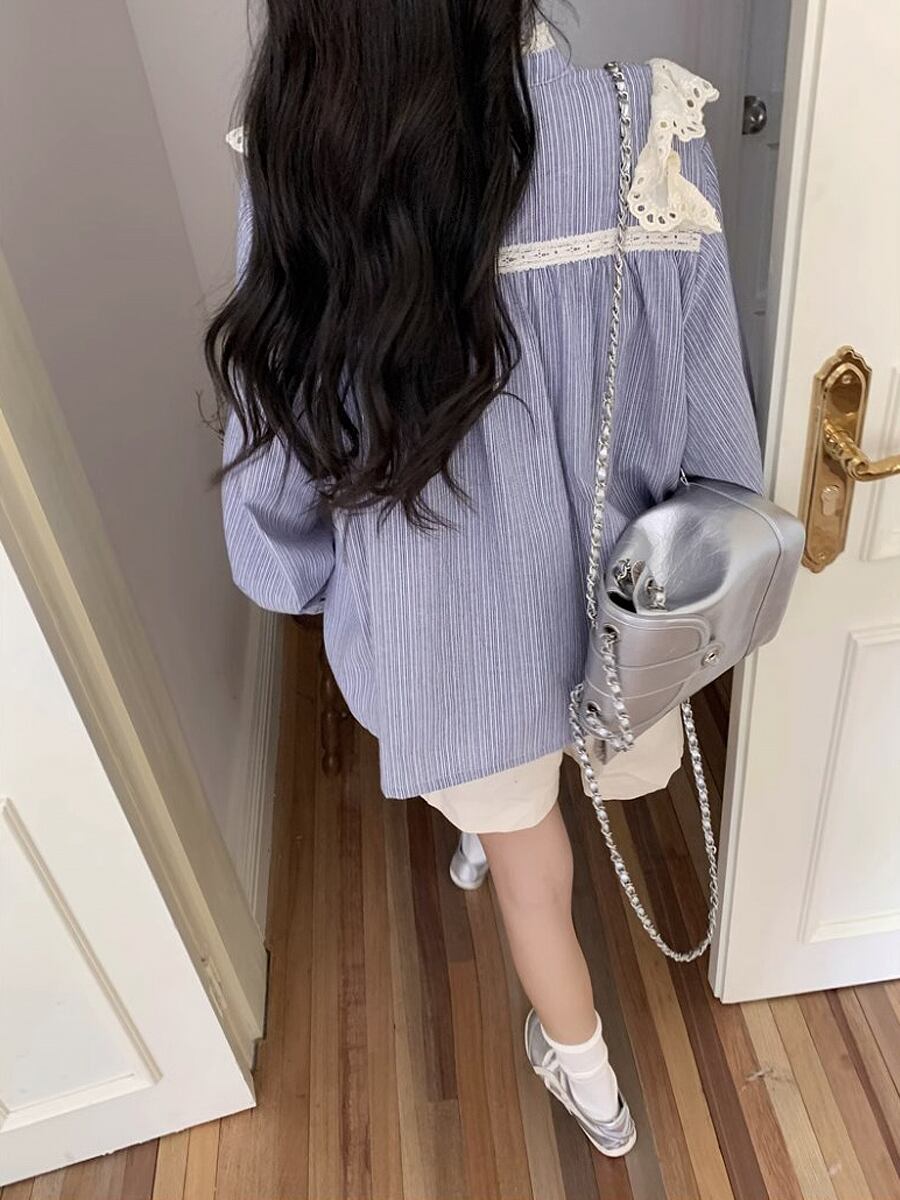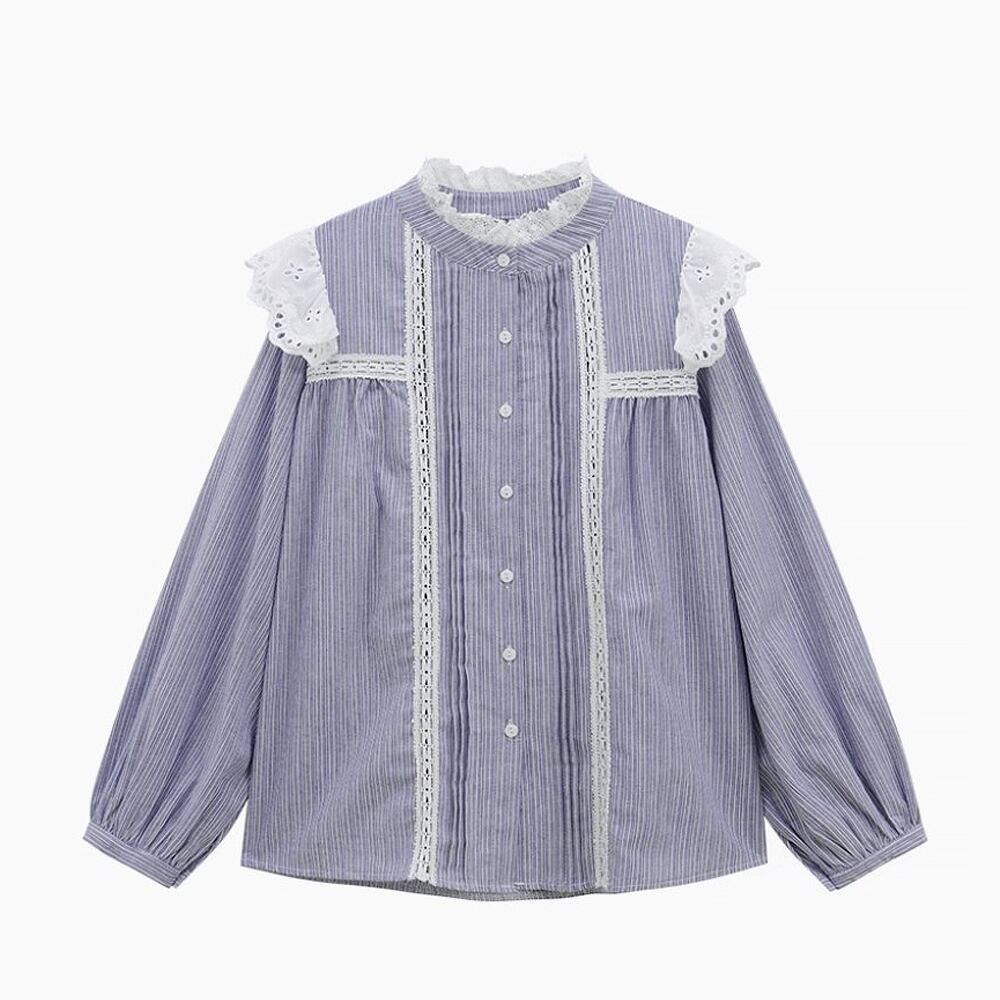 フリルスタンドカラーブルーストライプトップス トップス デート シャツ ブラウス ミディアム丈 袖あり 長袖 ボリューム袖 ノーカラー パフスリーブ フレアスリーブ ホルンスリーブ 萌袖 ビッグカラー 襟付き 切り替えデザイン ドッキング スマート フリル 前開き 薄手 かわいい 大人可愛い きれいめ ストライプ 上品 おしゃれ お洒落 レトロ 大人女子 こなれ感 ラフ ラブリー キュート ガーリー 個性的 モダン 主役級 存在感 抜け感 柄 韓国コーデ 韓国ファッション ブルー 青