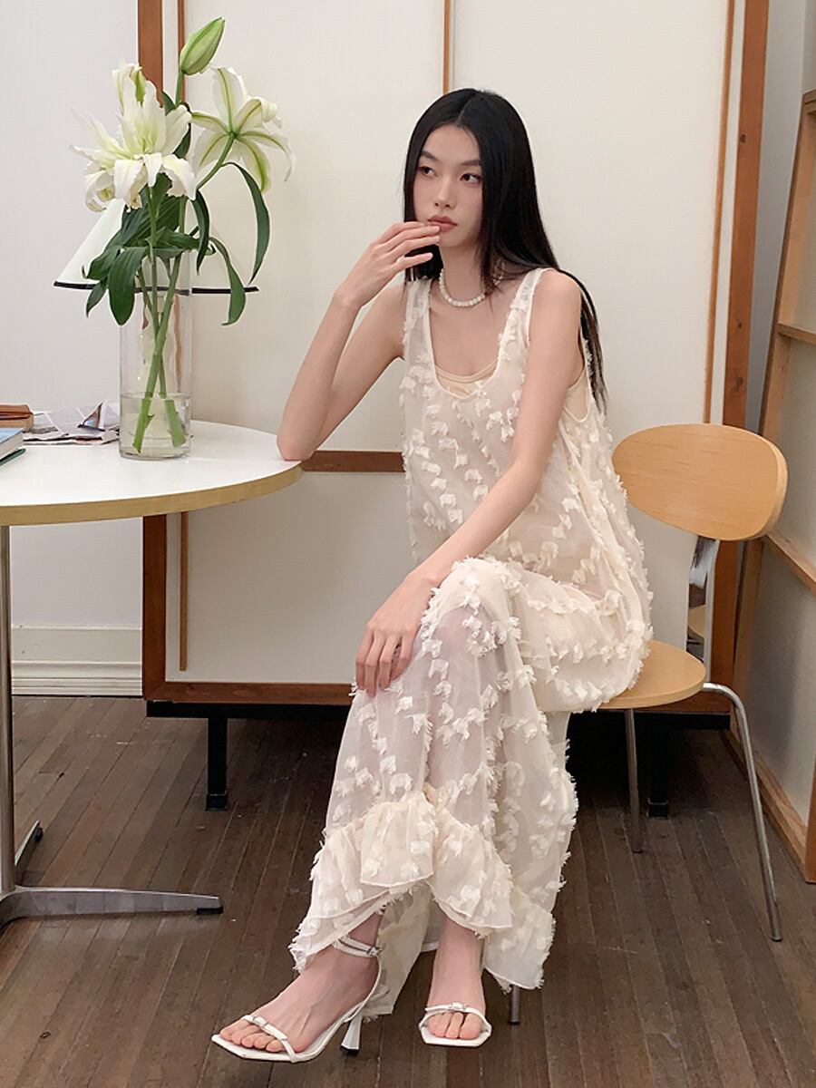 フェザー生地ノースリーブワンピース ワンピース インナーワンピース付き レイヤードワンピース ロング ロングワンピ ワンピドレス ドレス フェザー生地 羽生地 ふわふわ モノカラー aアイボリー お呼ばれ 大人っぽい 質感素材 重ね着ワンピー 重ね着ワンピース 上品 ゴージャス 高見え 大人可愛い おしゃれ キュート レディース ビーチ プール リゾート 旅行 体系カバー 美脚 脚長 スタイルアップ 美スタイル モテ インスタ映え 韓国コーデ 韓国ファッション