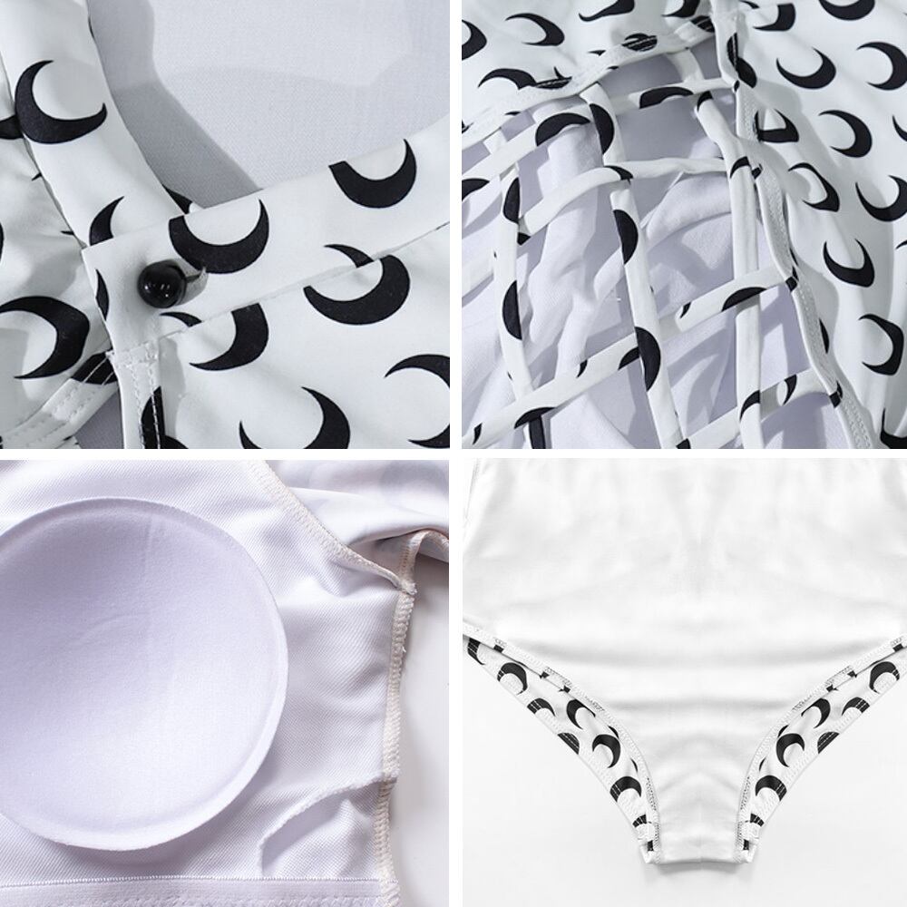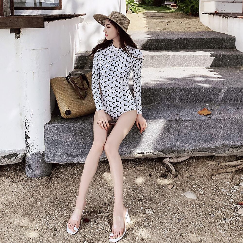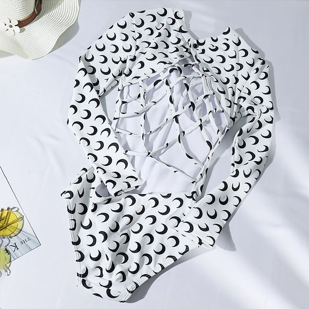 全2色 水着 長袖三日月プリントバックコンシャスワンピース パッド付き ワンピース水着 長袖 ラッシュガード 三日月 バックシャン バックコンシャス バックカットアウト かわいい 大人可愛い きれいめ セクシー 華やか 大人っぽい おしゃれ キュート 個性的 クール モード系 スタイリッシュ レディース ビーチ プール リゾート 旅行 体系カバー 二の腕カバー 美脚 脚長 スタイルアップ 美スタイル 韓国ファッション 韓国コーデ スタイル 高見え 格上げ モテ インスタ映え