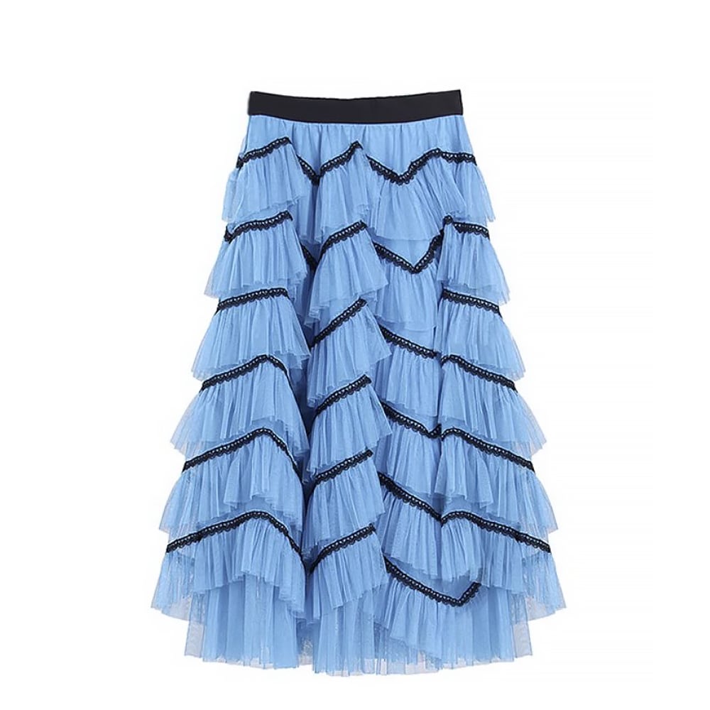 チュールティアードロングスカート ミモレ丈 チュール レース 段々フリル ティアード レースライン フリル ハイウエスト かわいい 大人可愛い きれいめ カジュアル 大人 おしゃれ 大人女子 こなれ感 キュート 個性的 主役級 存在感 レディース 学生 通学 デート お出かけ 女子会 休日 パーティー イベント 着回し 普段使い 韓国 オルチャン ファッション コーデ スタイル 脚長 ブルー S M L XL 韓国コーデ 韓国ファション ブルー 青