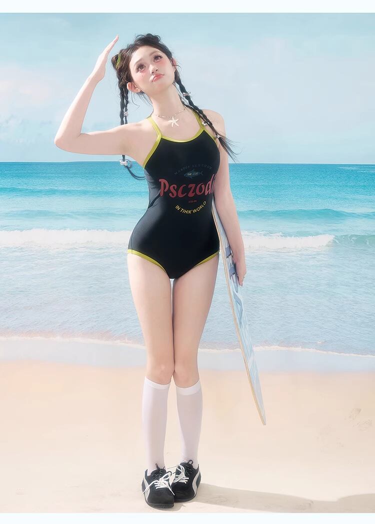 くすみグリーンのパイピングが黒地に映えるワンピース水着です。
