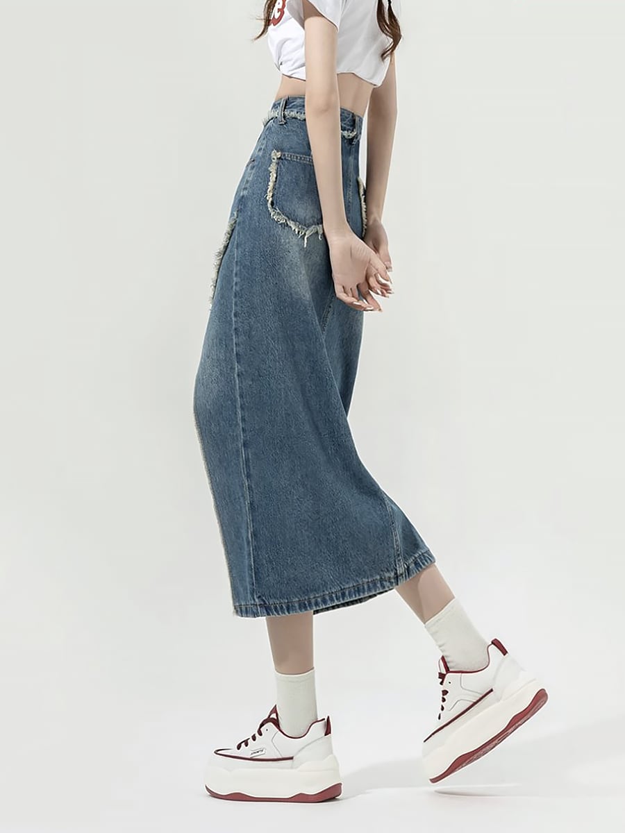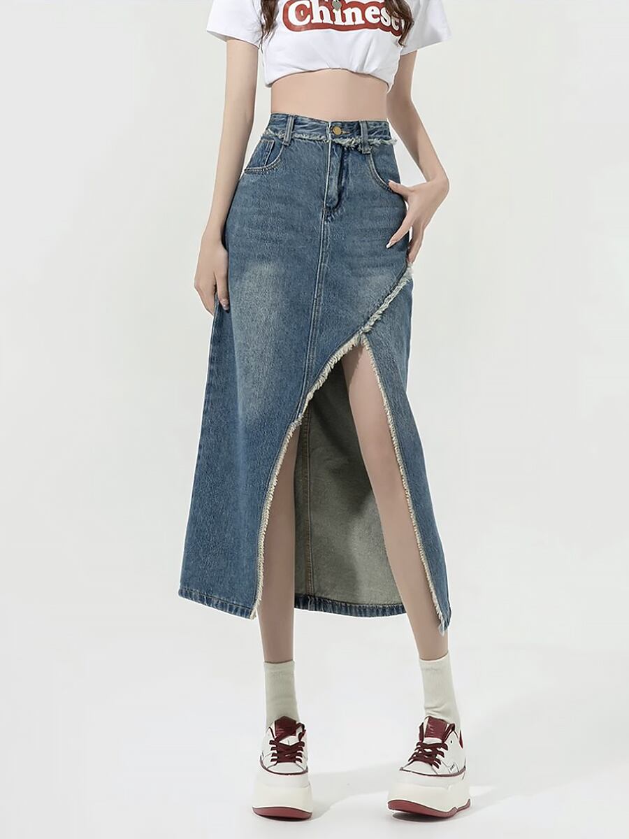 全2色 アンシンメトリースリットデニムロングスカート 黒 ブラック デニムブルー 青 スカート タイトスカート デニムスカート 膝下 ミモレ ミモレ丈 ロング ロング丈 スリム タイト 細身 スリット デニム カラーデニム フリンジ ダメージ カットオフ かわいい 大人可愛い きれいめ シンプル おしゃれ かっこいい レトロ こなれ感 ラブリー キュート ガーリー 個性的 主役級 存在感 抜け感 オールシーズン レディース 着回し 普段使い 韓国コーデ 韓国ファッション