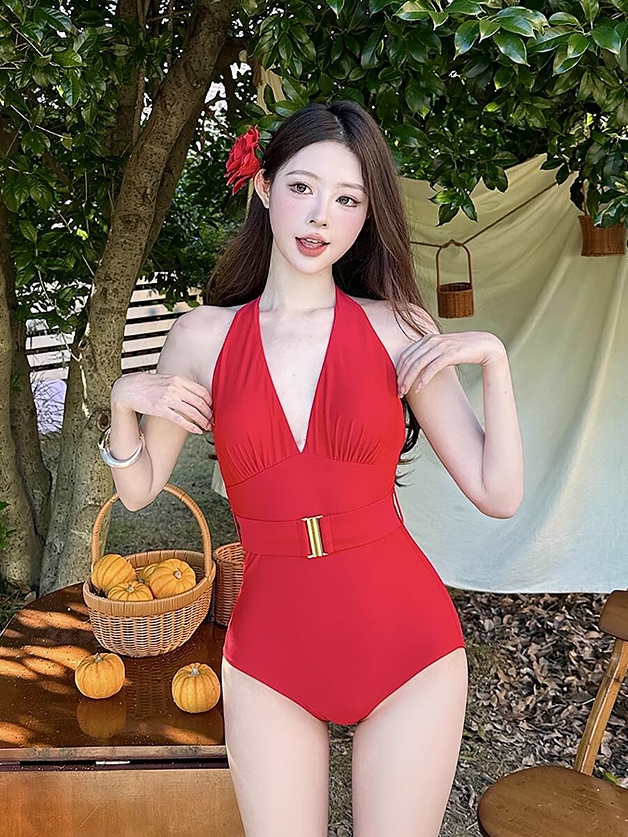 全2色 プランジングホルターネックワンピース ワンピース水着 ホルターネック バックリボン ベルト風デザイン ゴールドバックル バックル パット付き ノンワイヤー ウエストマーク ウエスト細見え 切り替えデザイン ハイウエスト 胸元 かわいい セクシー 大人可愛い おしゃれ 主役級 ラブリー キュート ガーリー コスプレ風 無地 レディース 上品 お嬢様 海 ビーチ プール リゾート 美脚 脚長 着痩せ 韓国系 オルチャン 赤 レッド ブルー ライトブルー 水色 空色 韓国コーデ