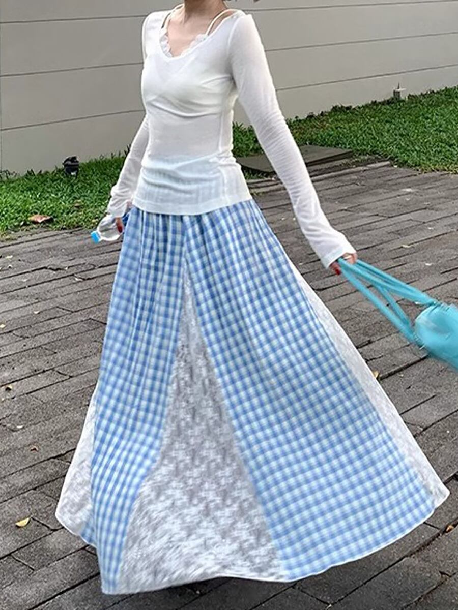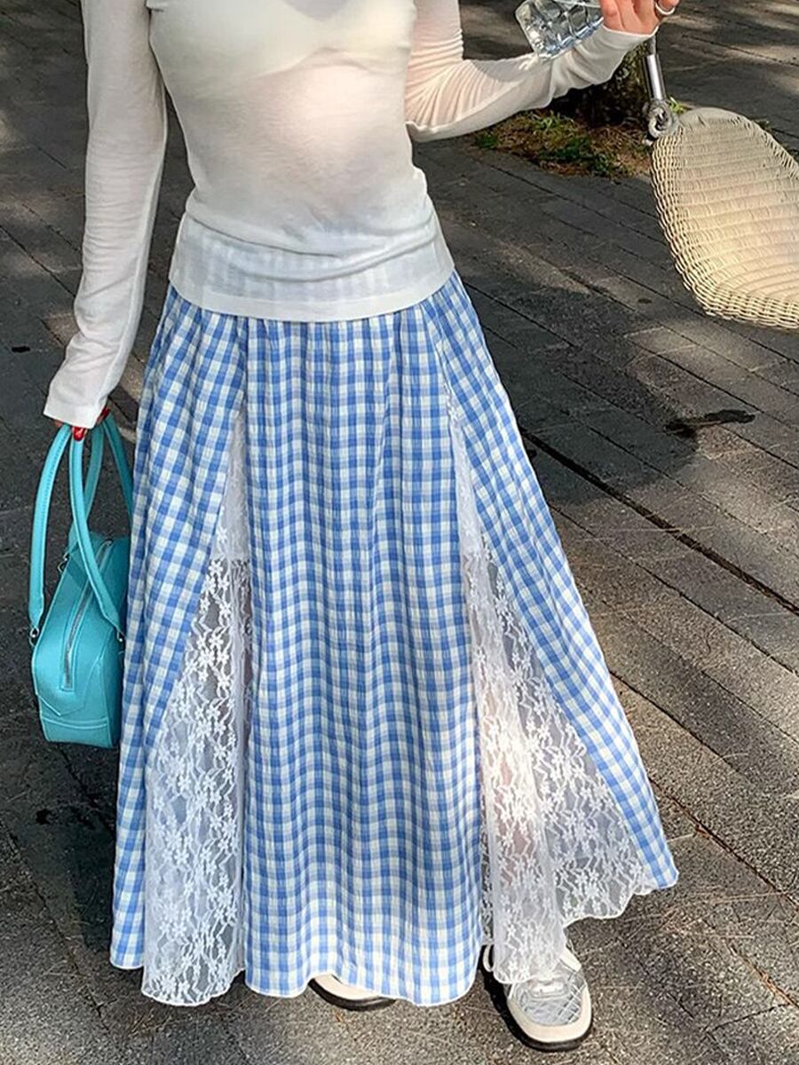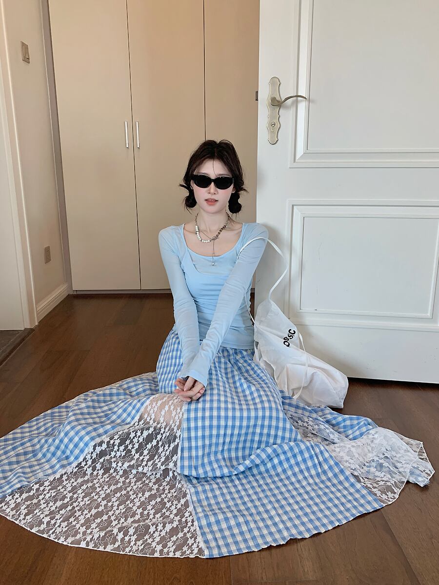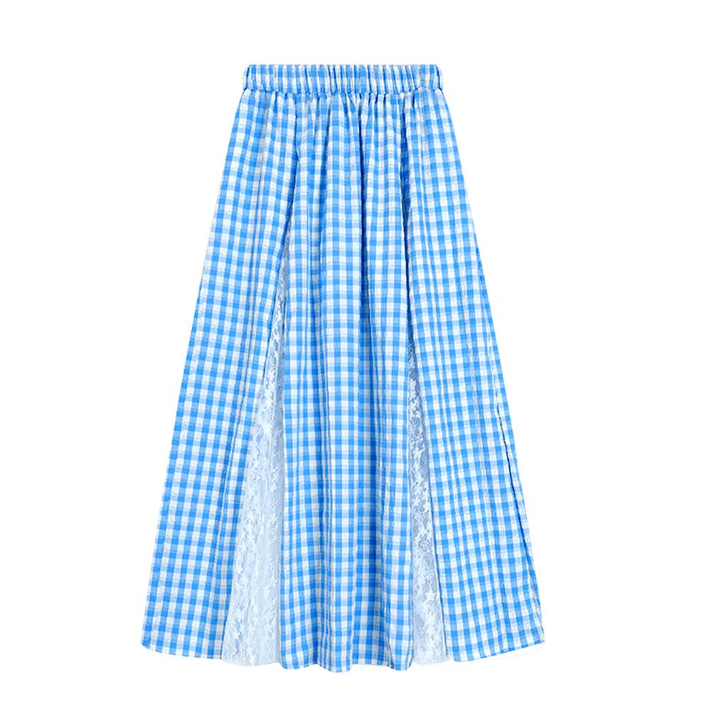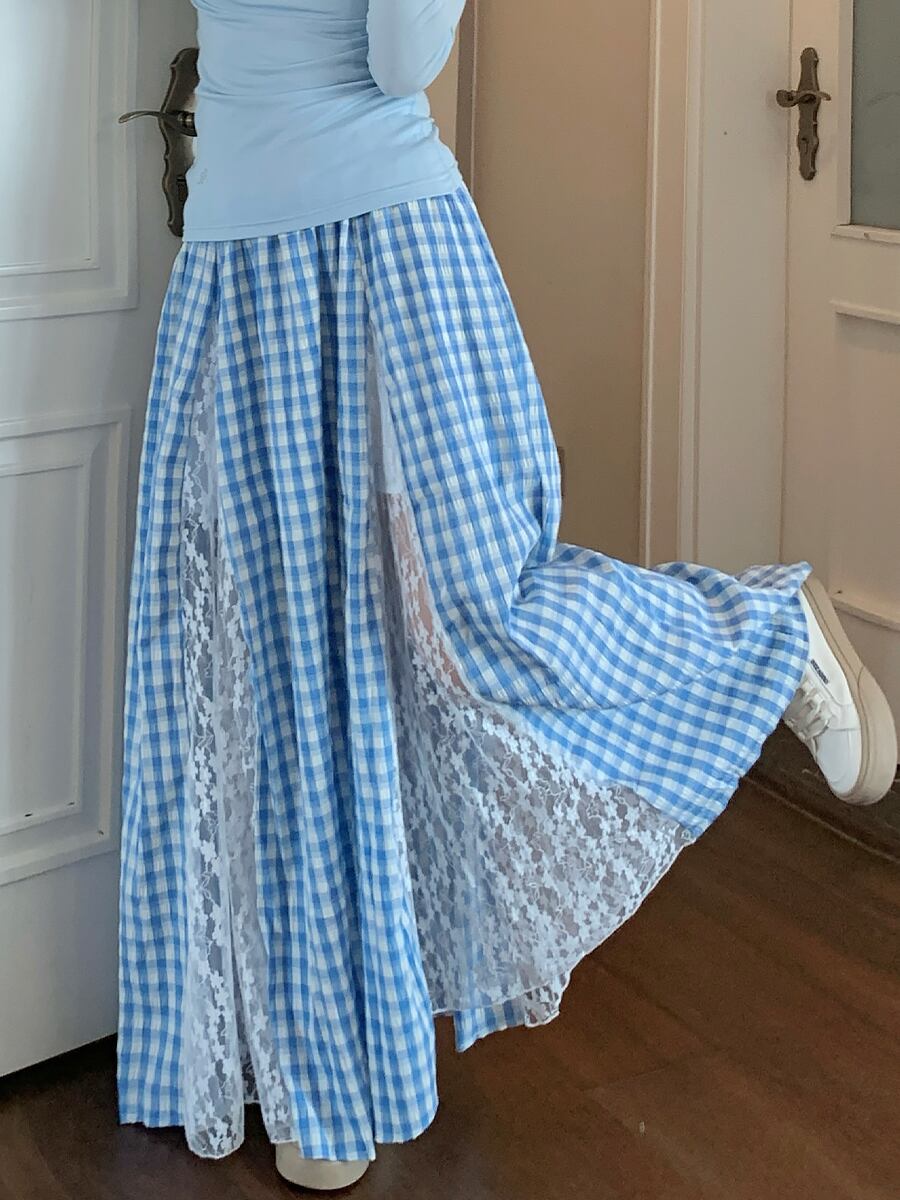ドッキングレースチェック柄ロングフレアスカート ブルー 青 タータンチェック ライトブルー ロングスカート フレアスカート Aライン ウエストゴム かわいい 大人可愛い きれいめ ウエスト楽ちん 楽ちん らくらく カジュアル 大人 上品 おしゃれ お洒落 かっこいい レトロ エキゾチック 大人可愛い 大人女子 レディース ビジネス OL 通勤 学生 通学 デート お出かけ 休日 リゾート 旅行 海 プール ホテル ガーデン レストラン 韓国ファッション