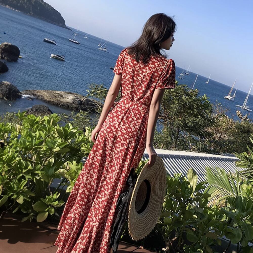 カシュークールで歩くたびに裾がわれて、足がチラ見えし、美脚効果もばっちりな夏のリゾートワンピースです。