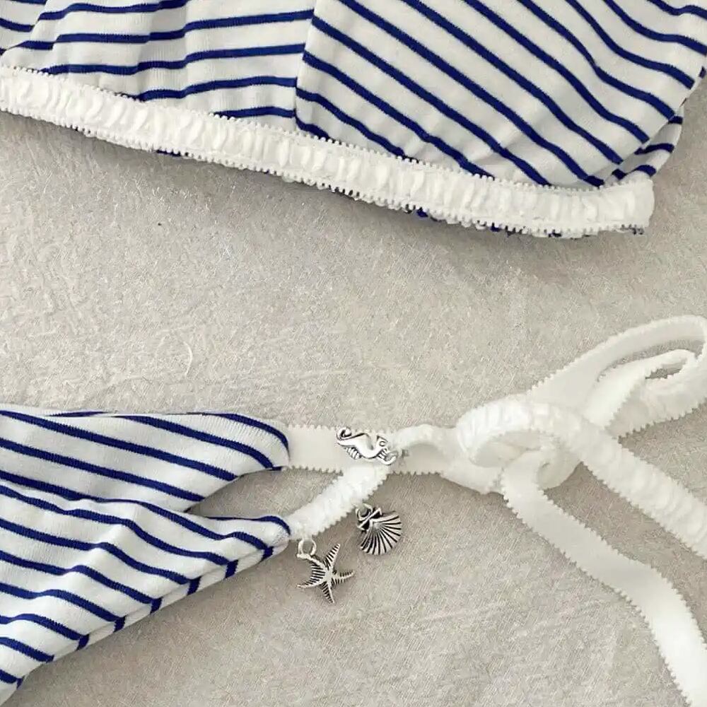水着 マリンストライプタイサイドビキニ ビキニ ホワイト 白 青 ブルー 錨マーク アンカーマーク 貝殻 シェル 海星 チャーム付き レディース ビキニ ストライプ シマシマ 縞々 ツーピース セパレート スイムウェア タイサイド 紐ビキニ パッド付き ノンワイヤー ワイヤーなし レトロ シック セクシー 大人 おしゃれ スタイリッシュ お洒落 個性的 レディース ホテル 温泉 海 ビーチ プール リゾート 旅行 着痩せ スタイルアップ オルチャン 韓国コーデ 韓国ファッション