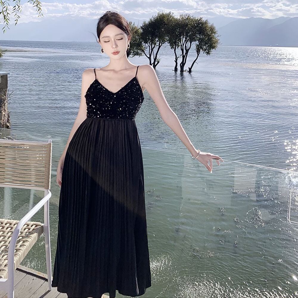 スパンコールキャミソールドレス キャミソールワンピース ブラックドレス 黒 ブラック キャミドレス パーティドレス 光沢あり プリーツ キラキラ カジュアルドレス ハイウエスト Aライン プリンセスライン 大人 上品 大人女子 マキシ マキシ丈 フェミニン パーティ 無地 かわいい 大人可愛い お洒落 結婚式 大人可愛い 大人女子 こなれ感 ラブリー レディース デート お出かけ 韓国コーデ 韓国ファッション