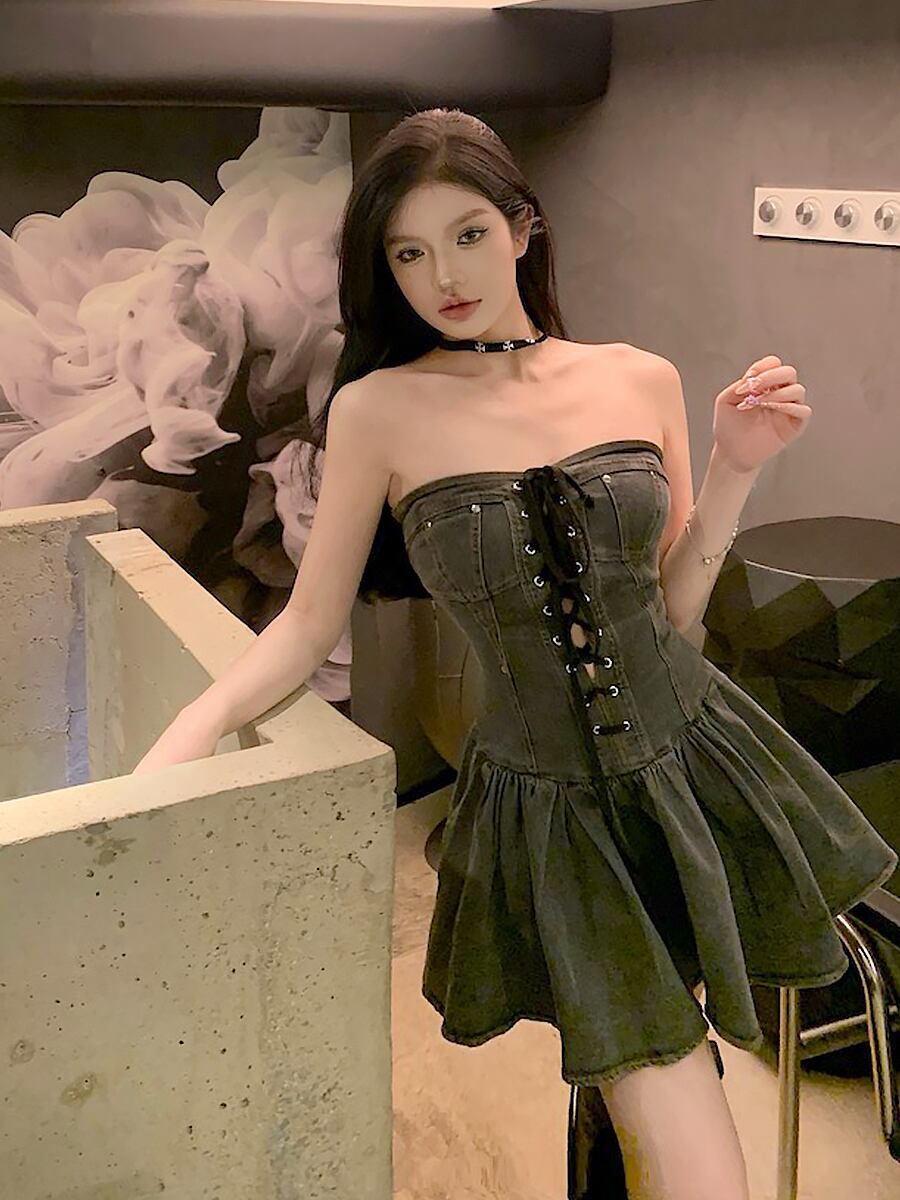 チューブトップブラックデニムミニワンピ レディース ミニワンピース ベアバック 肩出し レースアップ 編み上げ セクシー ミニ ミニワンピ リベット 鋲付き 鋲 リベット付き ミニ丈 フレア フレアワンピ ワンピース 膝上 ボディコンワンピース タイト ノースリーブ レトロ 個性的ドレス レトロ 個性的 お洒落 おしゃれ 可愛い かわいい フェミニン クール 大人 大人可愛い 大人女子 韓国コーデ 韓国ファッション 黒 デニム