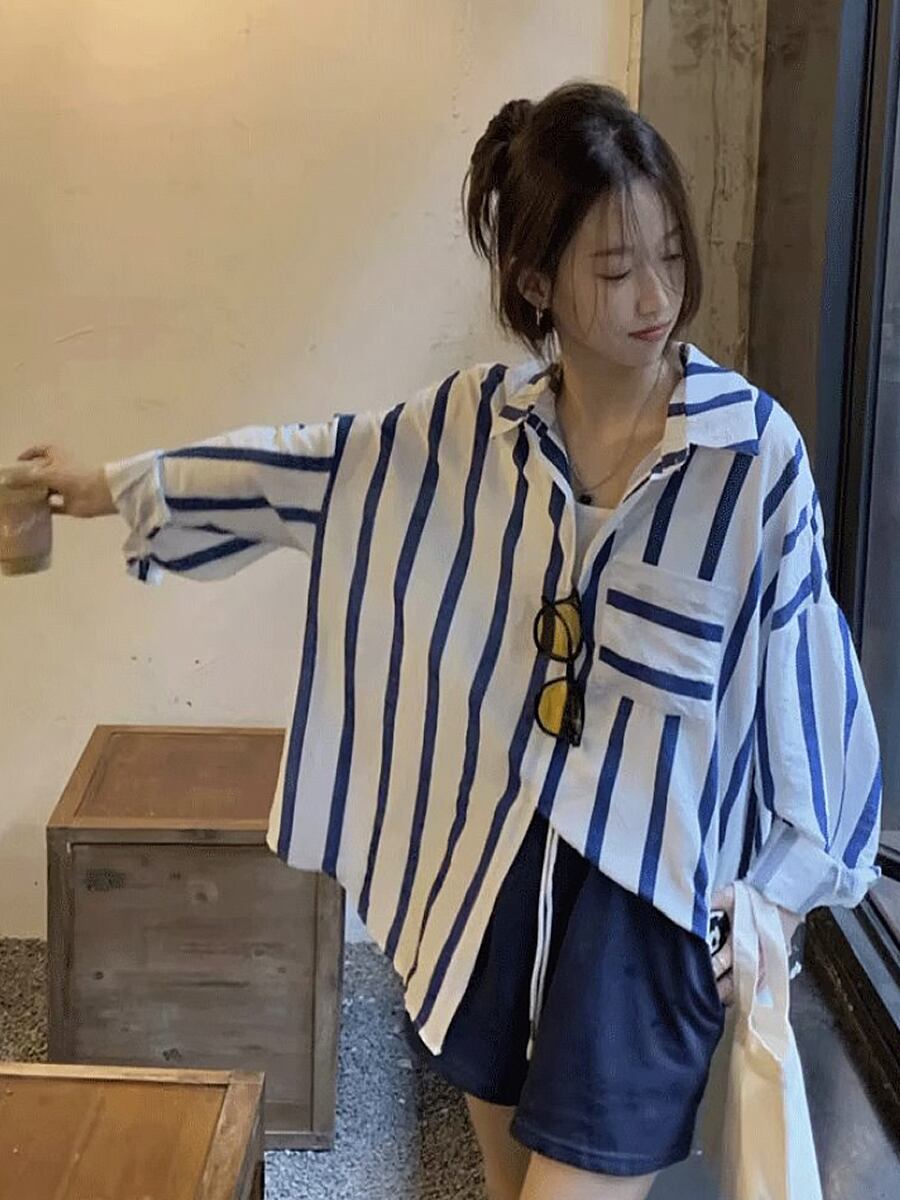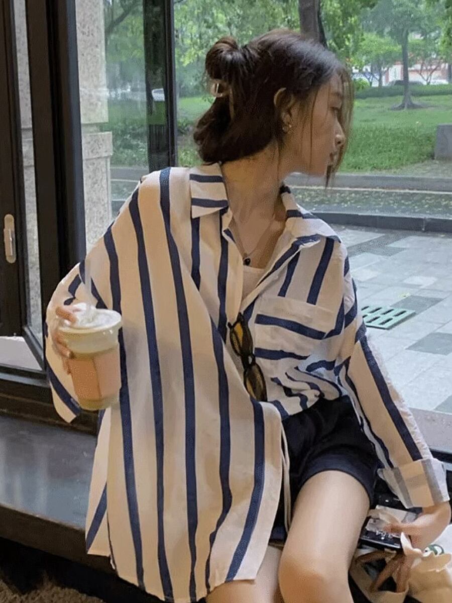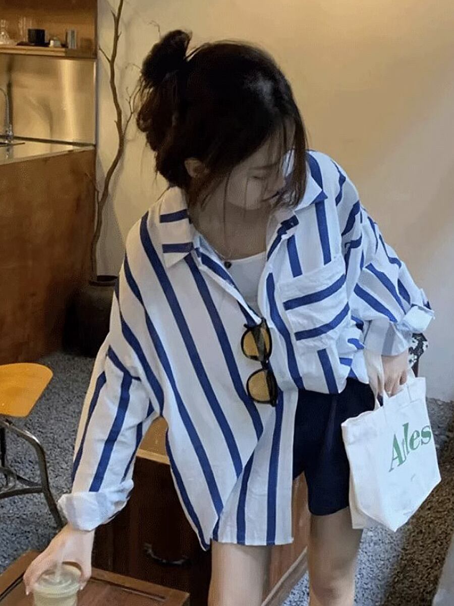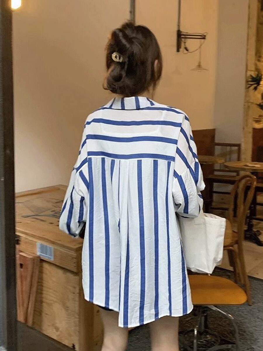 ブルーストライプオーバーサイズシャツ シャツ ブラウス シマシマ ストライプ 袖あり 長袖 Vネック 襟付き 薄め ワイド 羽織り ゆったり 大きめ カーディガン代わり かわいい 大人可愛い シンプル カジュアル 大人 上品 おしゃれ お洒落 かっこいい 大人可愛い 大人女子 こなれ感 ラフ メンズライク ボーイッシュ キュート ガーリー ルーズ 個性的 レディース 学生 通学 着回し 普段使い スタイル モテ 体系カバー 韓国コーデ 韓国ファッション ホワイト ブルー