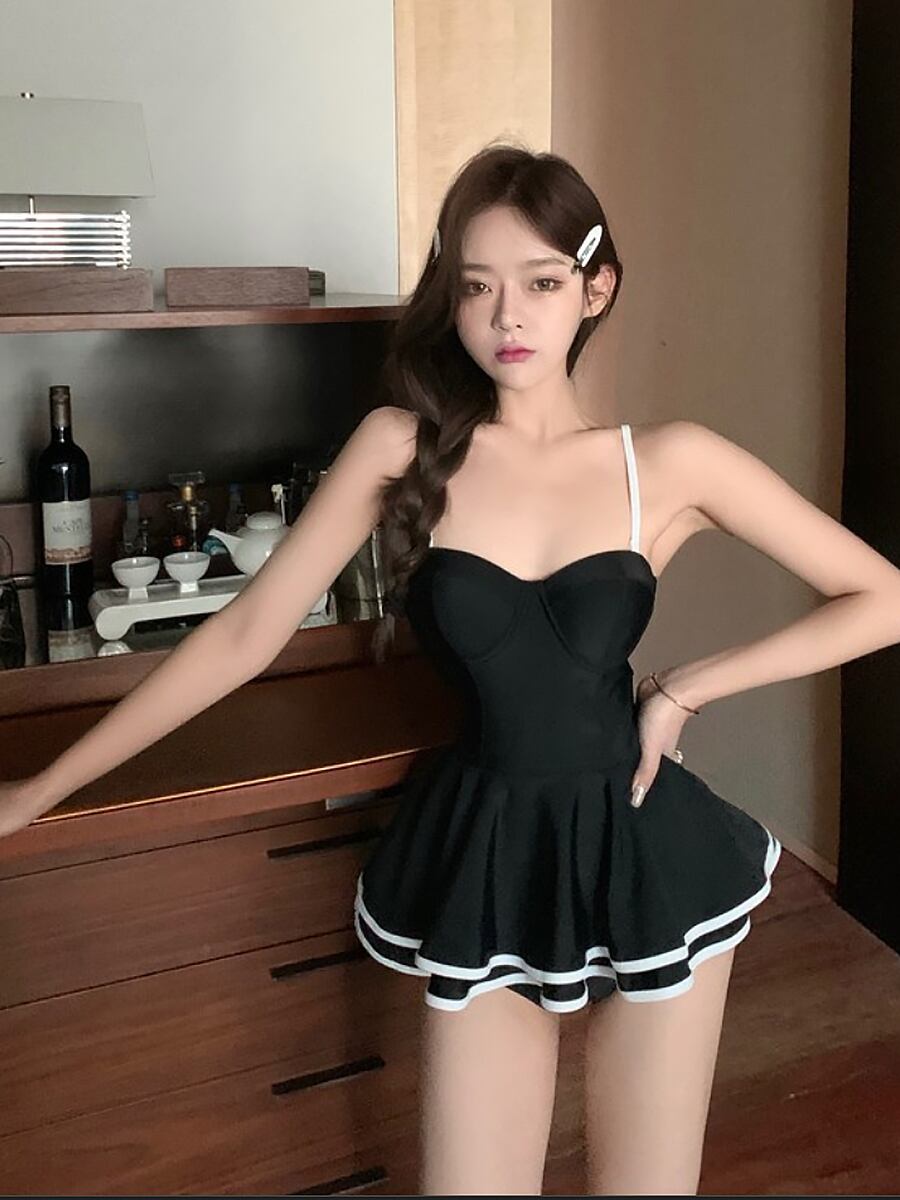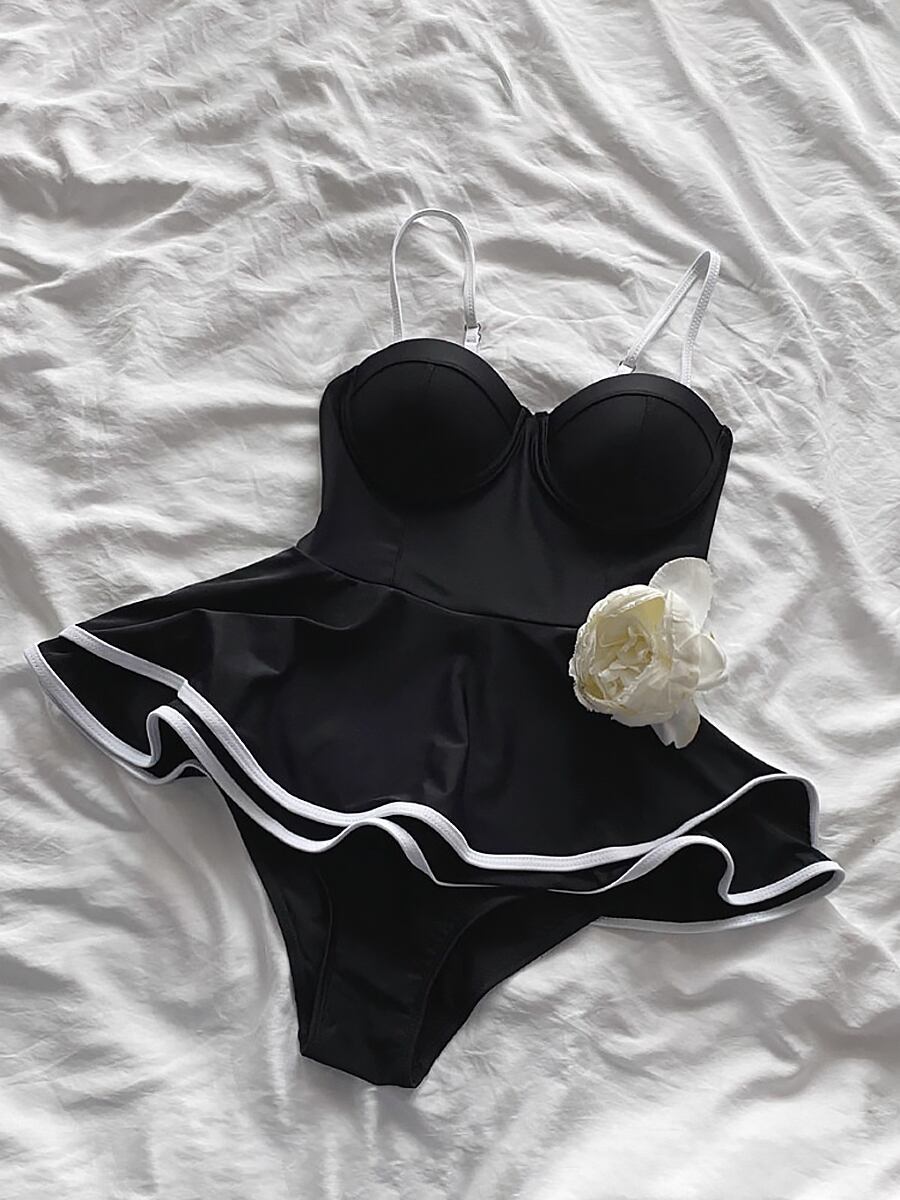水着 ワンピース水着 水着ワンピース スカート付きワンピース水着 バイカラー ライン入り 白 黒 ホワイト ブラック ホワイトライン ビスチェ風 ビスチェデザイン スカート付き水着 フレア ハイウエスト ハイウエスト切り替え レディース スイムウェア ハイウエスト パッド付き ワイヤーあり ワイヤー付き 体系カバー 大人可愛い ガーリー 可愛い おしゃれ お洒落 個性的 レディース ホテル 温泉 海 ビーチ プール リゾート 韓国コーデ