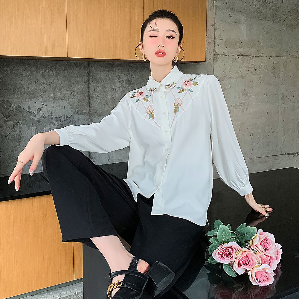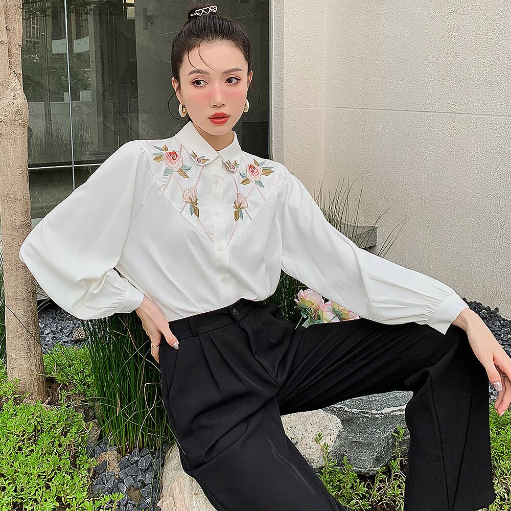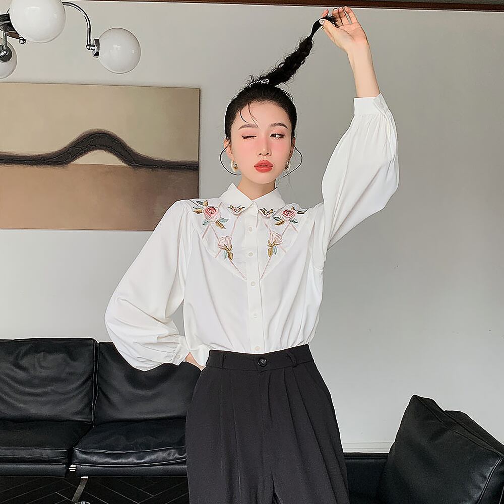 フランス刺繍 長袖 シャツ ブラウス レトロ フラワー 草花 刺繍 ブラウス ゆったり レディーストップス 気品 上品 蕾 薔薇 バラ 花柄 シャツブラウス ラウンドカラー ヨークスリーブ 前ボタン 切り替え 変則ラクランスリーブ きちんと感 通勤 学校行事 かわいい 大人かわいい モード系 お洒落 かっこいい 大人可愛い 大人女子 こなれ感 ラブリー レディース 韓国コーデ 韓国ファッション 白シャツ ホワイトブラウス